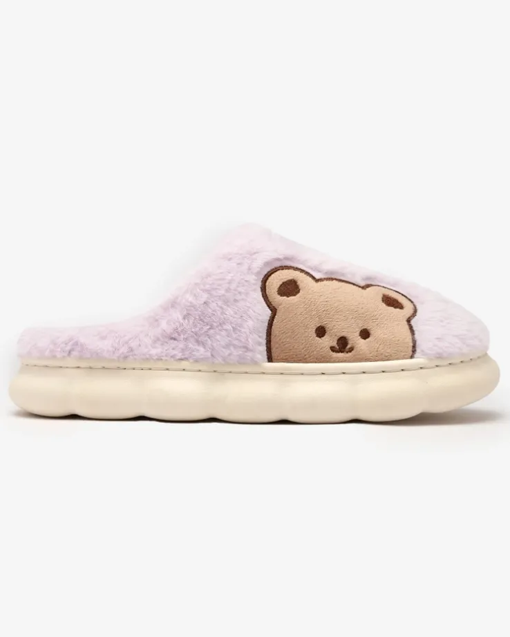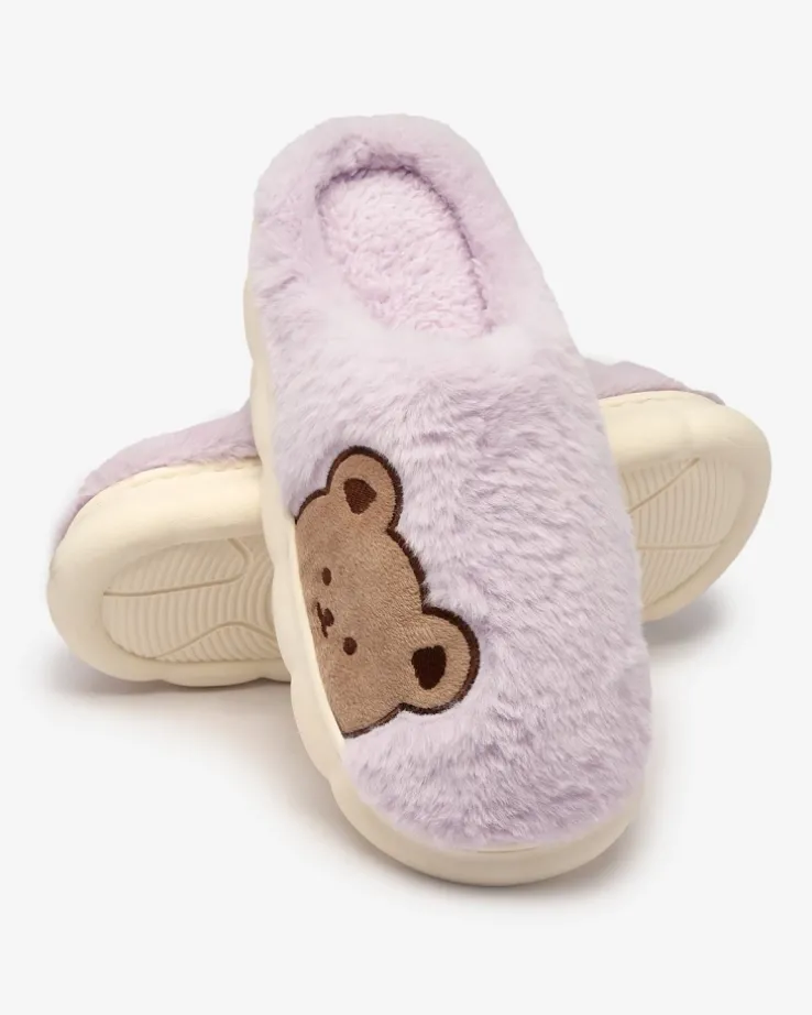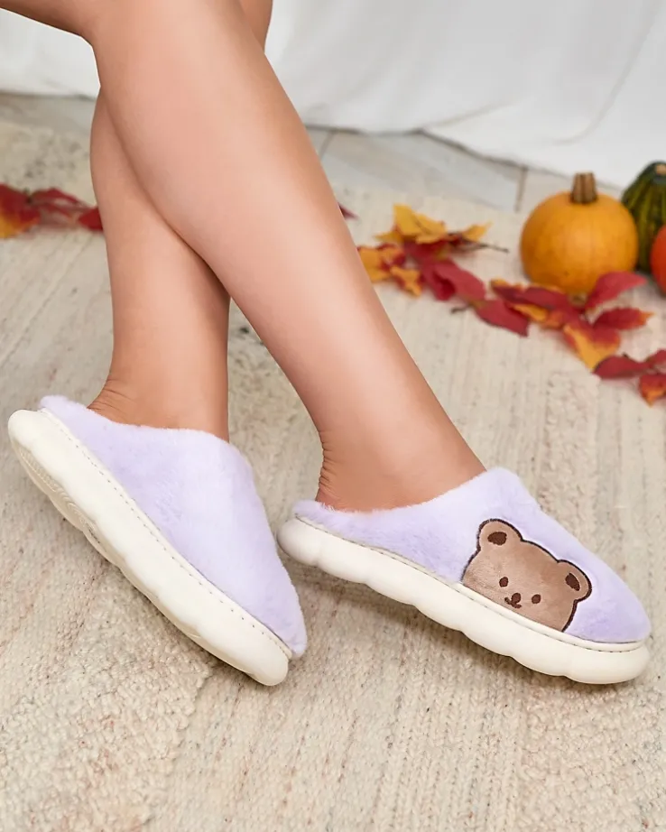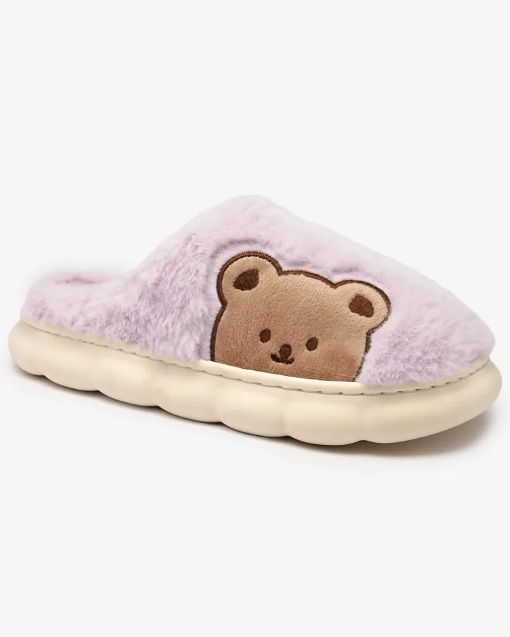 - Śliczne damskie kapcie na płaskiej podeszwie, zdobione naszywką z misiem. Model wykonany z materiału imitującego futerko. Świetna propozycją dla domowych outfitów!