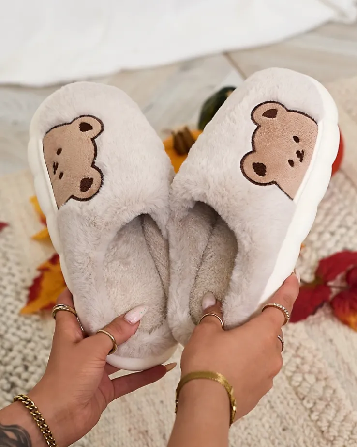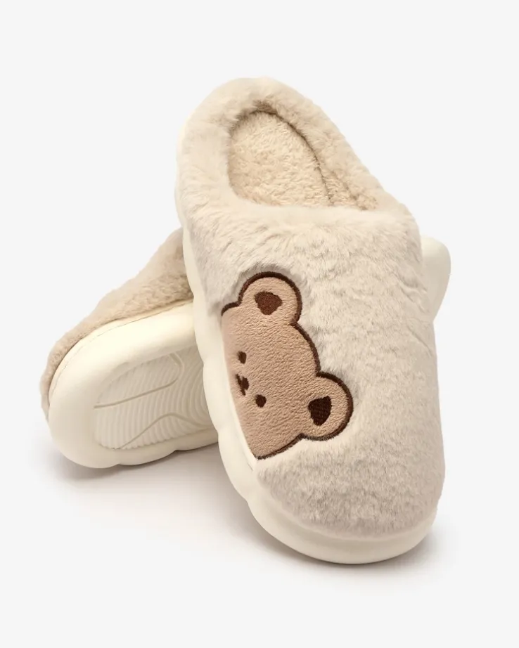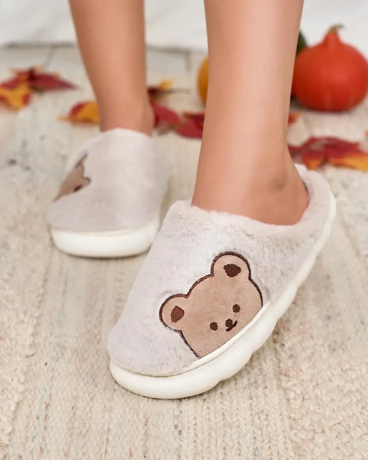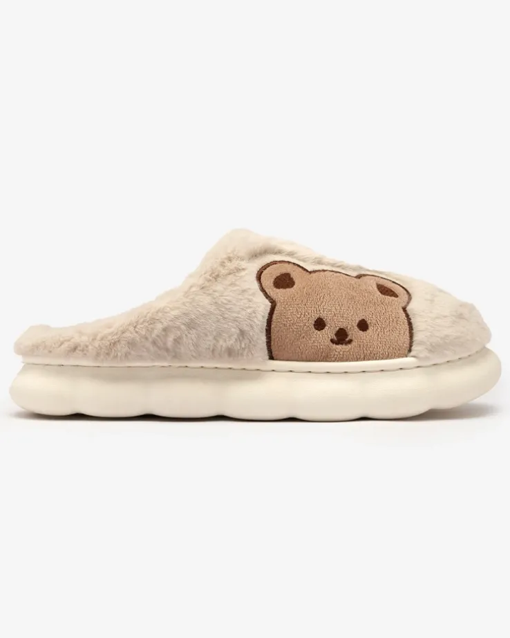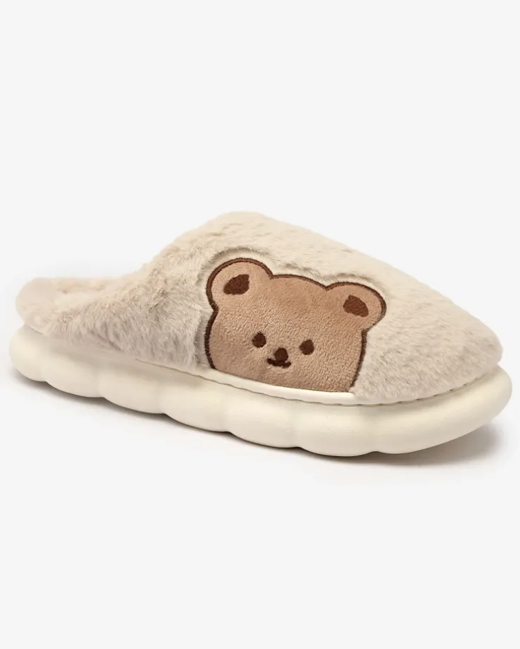 - Śliczne damskie kapcie na płaskiej podeszwie, zdobione naszywką z misiem. Model wykonany z materiału imitującego futerko. Świetna propozycją dla domowych outfitów!