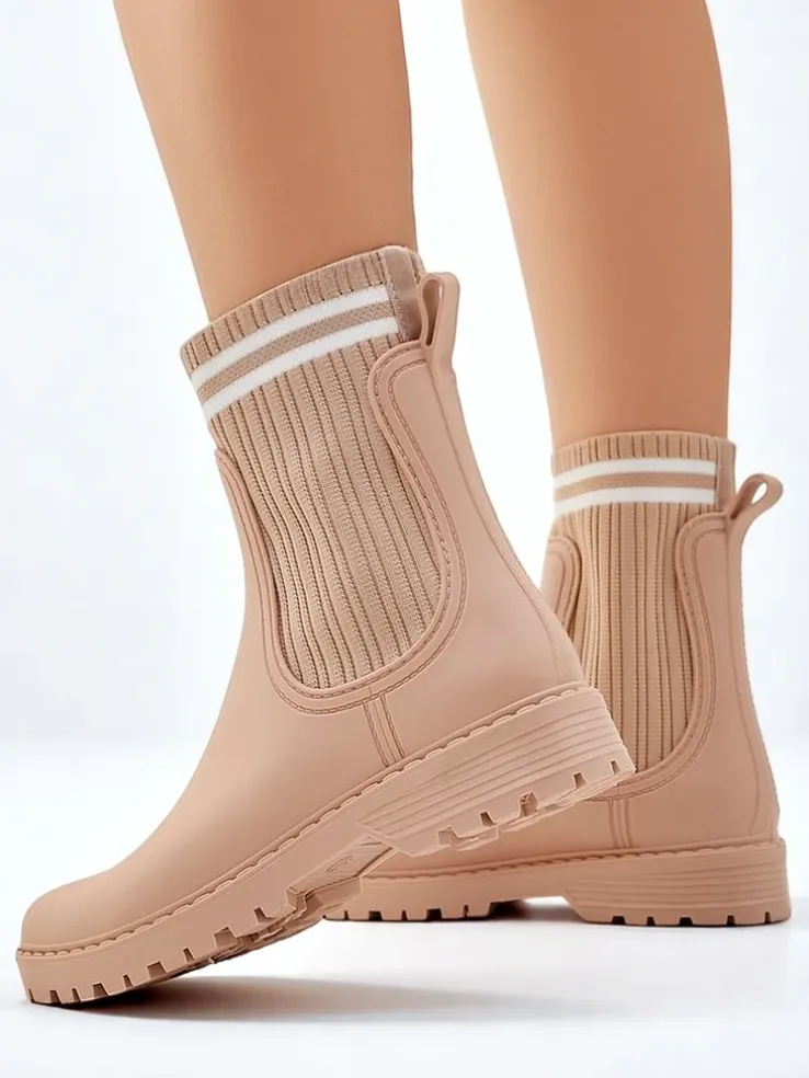 - Klasyczne damskie kalosze na płaskim obcasie, wykonane z materiału gumowego oraz wyższej, tkaninowej wstawki a 'la skarpetka. W środku wkładka z tkaniny. Idealne na wiosenne deszczowe dni!