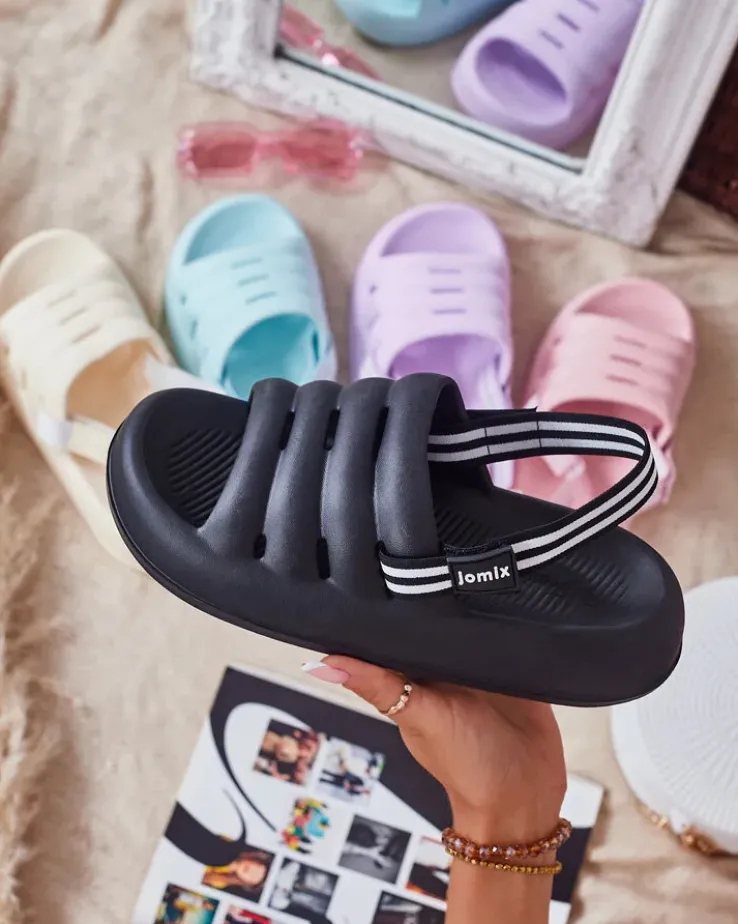 - Piękne damskie gumowe klapki na grubszej podeszwie. Model posiada całościowo asymetryczne kształty co dodaje im stylu. Obuwie posiada ozdobną, odpinaną gumę na piętę, która dodaje im komfortu. Idealny wybór do domu, ogrodu jak i na wakacje!