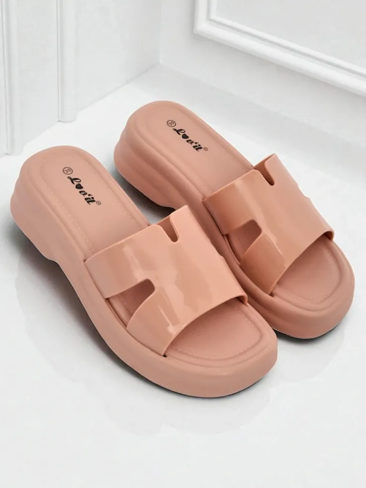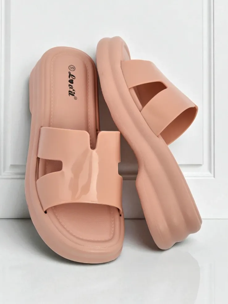 - Damskie klapki na grubszej podeszwie, z wkładką z ekologicznej skóry i paskiem z lakierowanej gumy. Nowoczesny styl i komfort w jednym – idealne do letnich, miejskich stylizacji.