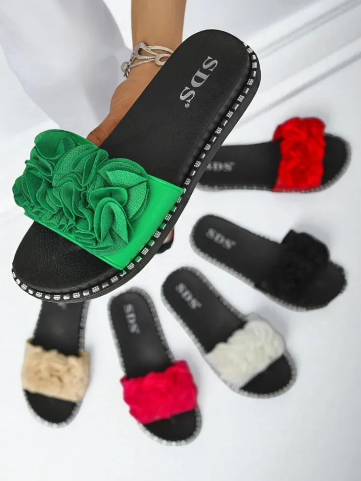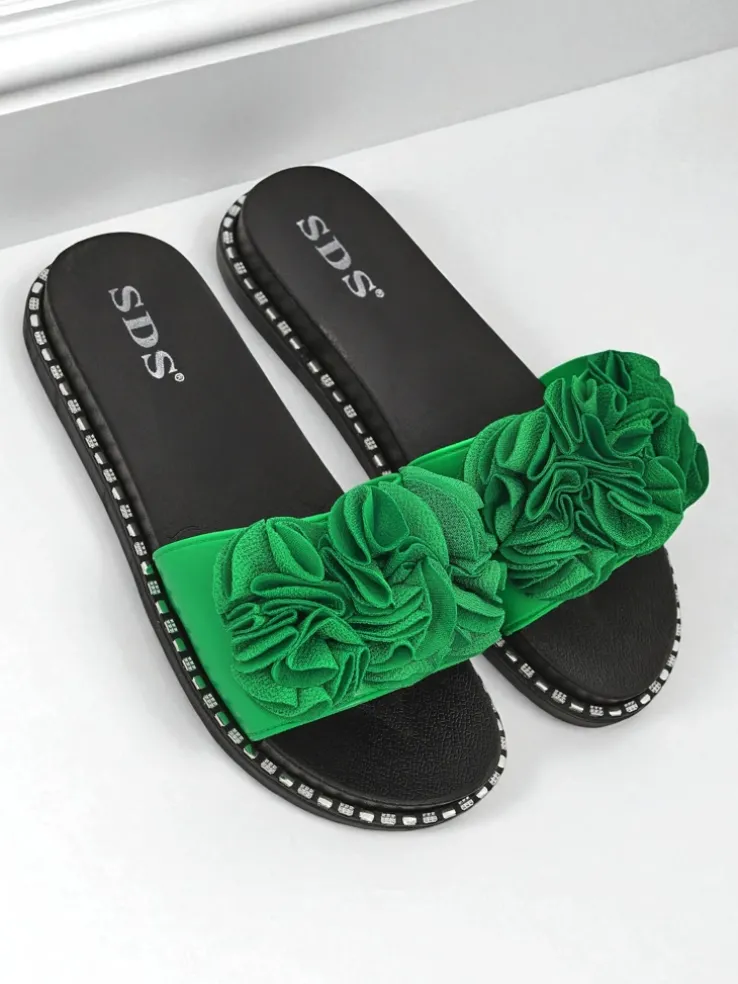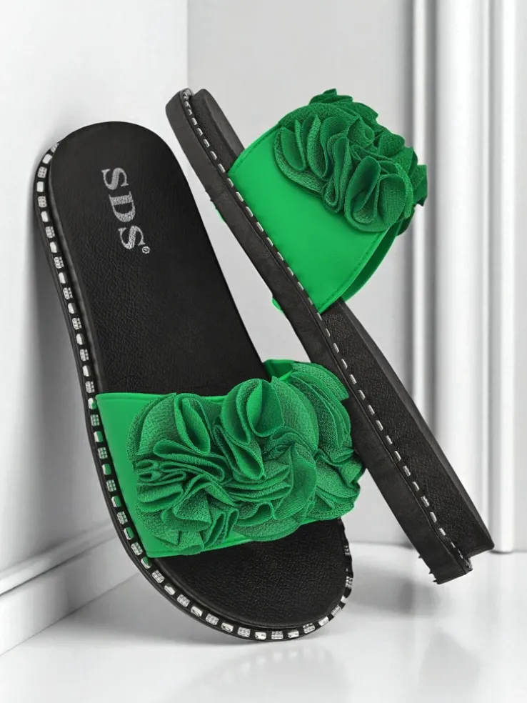 - Płaskie klapki damskie z eko skóry, z modnym, kwiatowym dodatkiem. Lekka, wygodna i stylowa propozycja na lato – ekologiczna elegancja na co dzień!