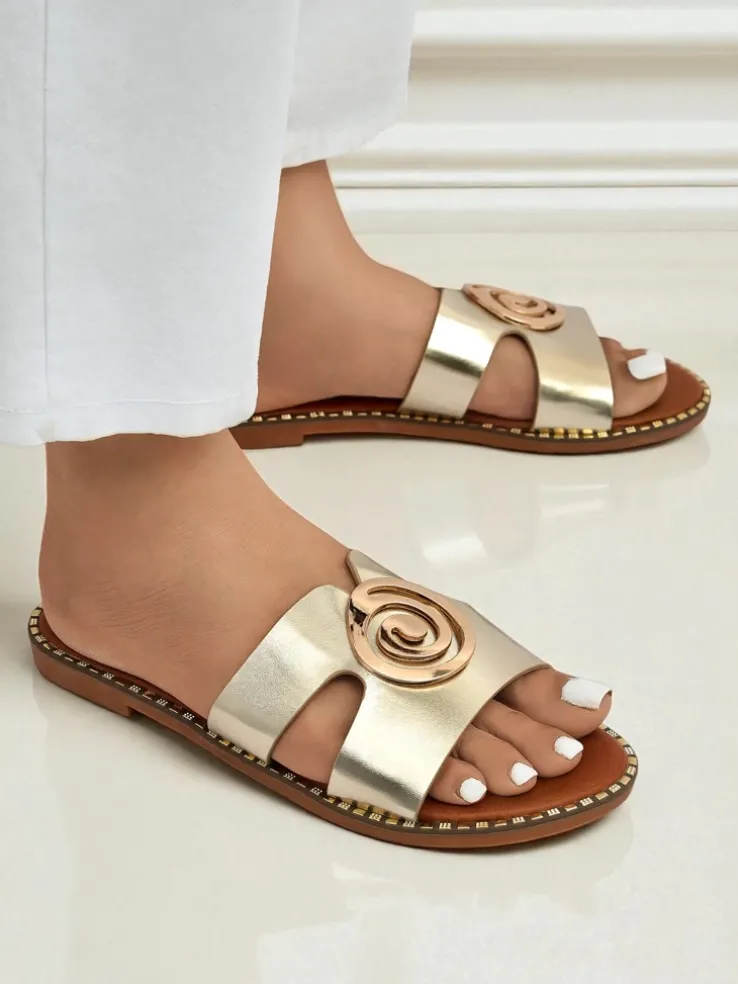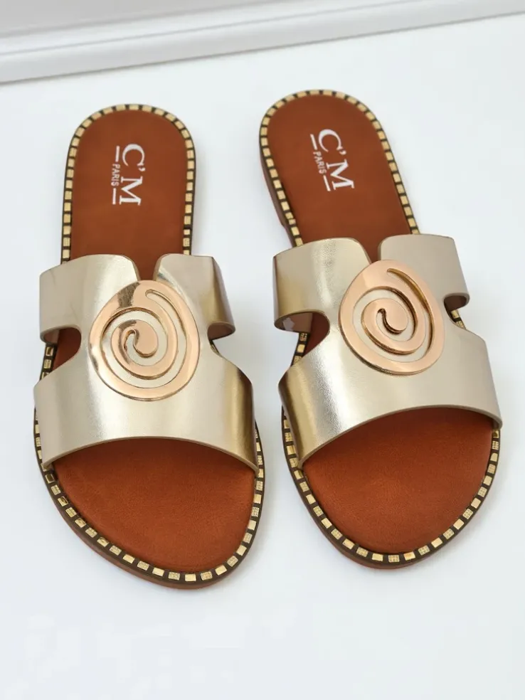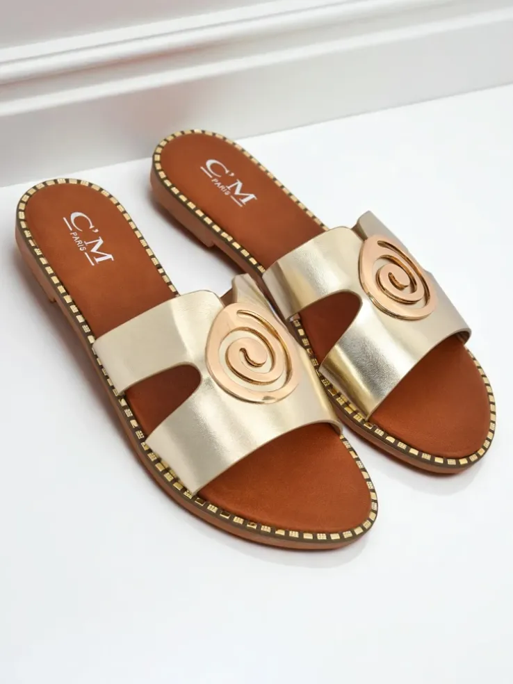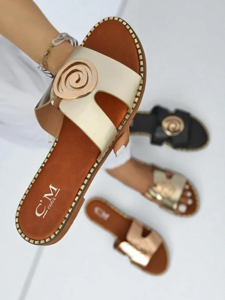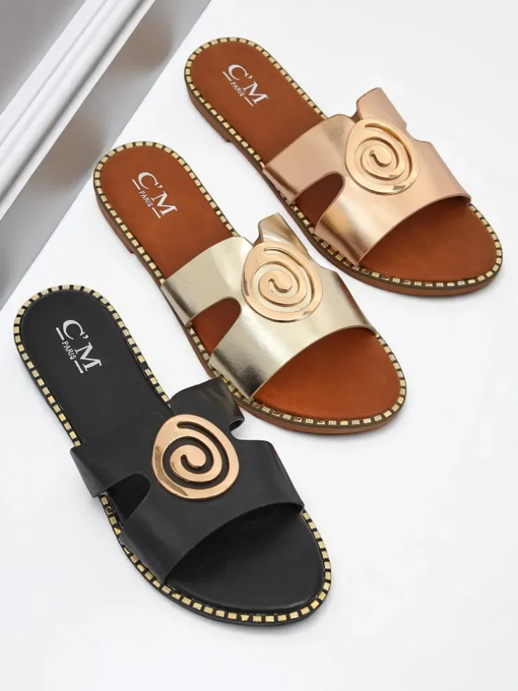 - Płaskie klapki damskie z eko skóry, ozdobione stylową aplikacją na cholewce. Idealne na ciepłe dni – lekkie, wygodne i modne. Doskonałe do letnich stylizacji, zarówno na co dzień, jak i na specjalne okazje.
