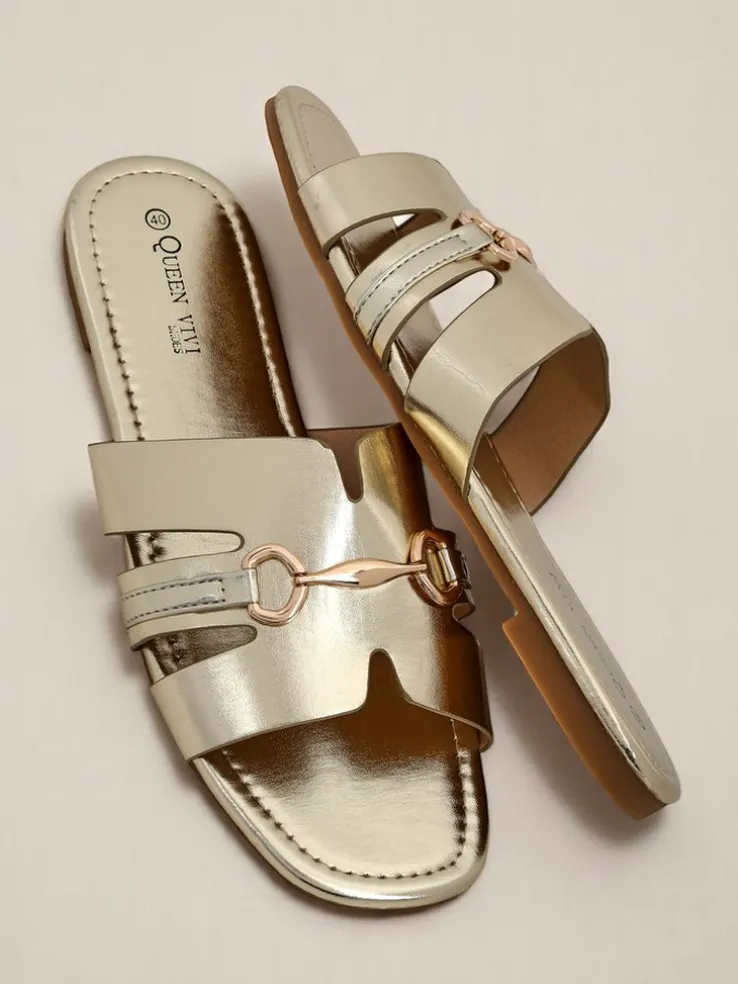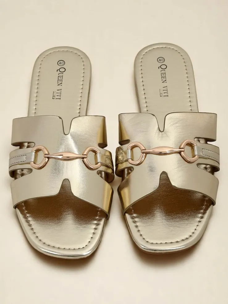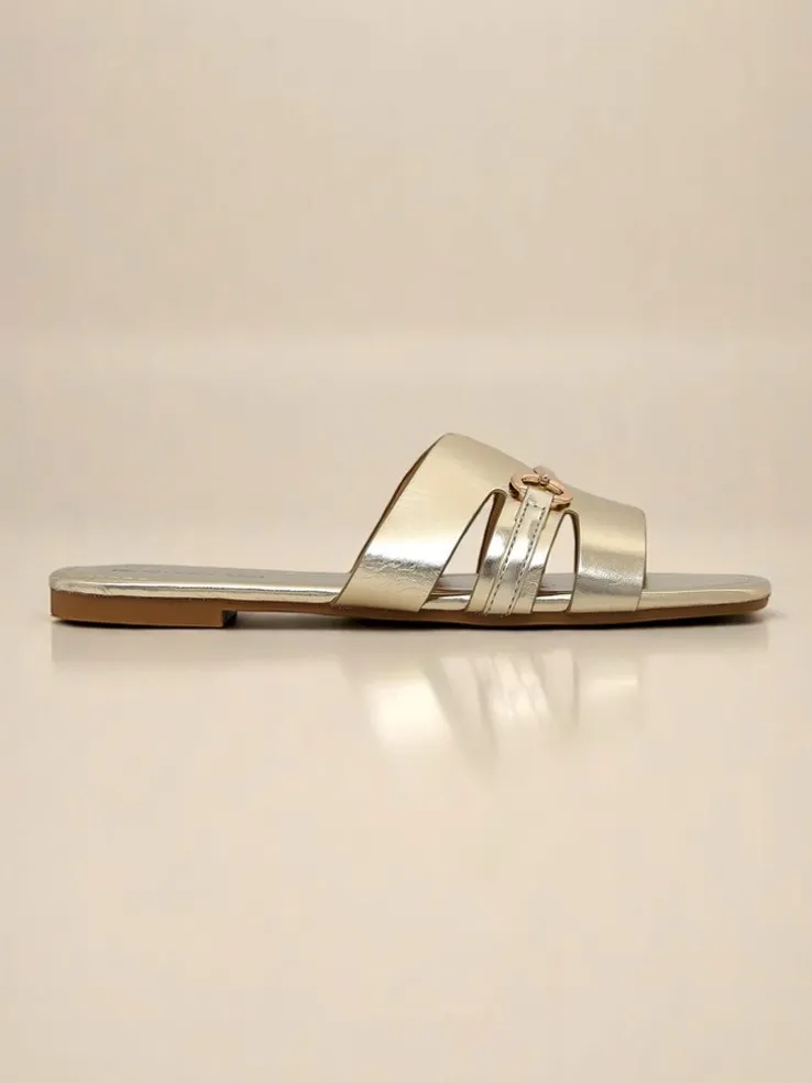 - Klapki z ekologicznej skóry, ozdobione subtelną złotą ozdobą. Elegancka prostota i komfort, które pasują do każdej letniej stylizacji.