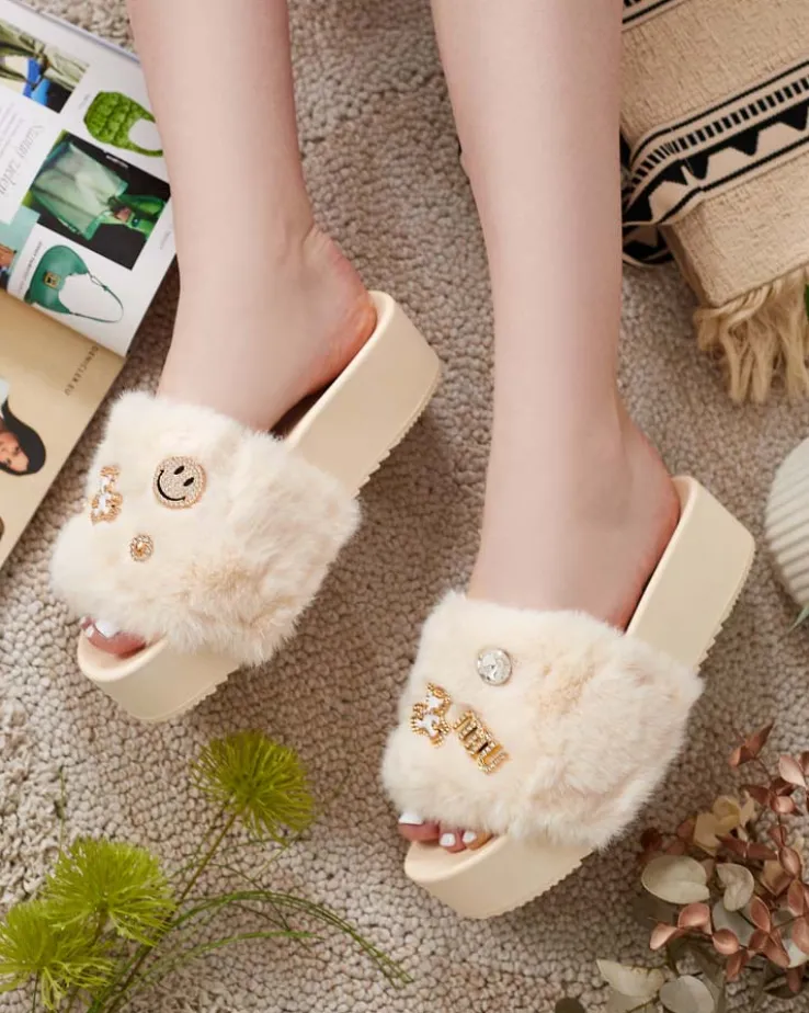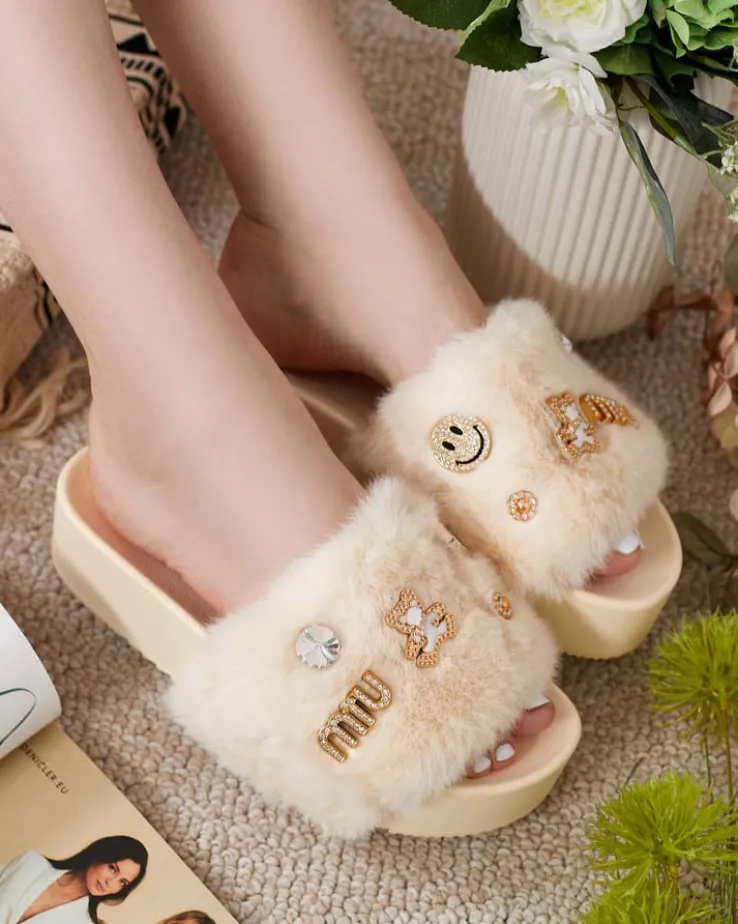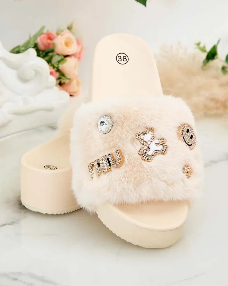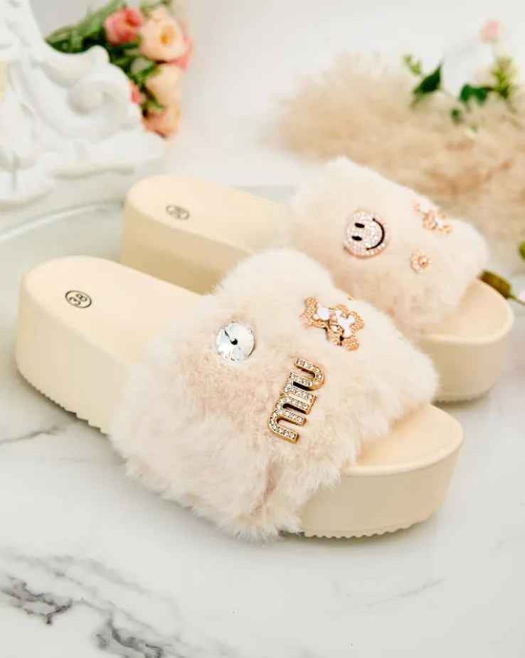 - Klapki damskie wykonane z eko skórzanej wkładki i futerkowej cholewki. Platforma i ozdoby na paseczku dodają uroku i charakteru. Ciesz się wygodą i stylem zabierając te obuwie na wakacje!