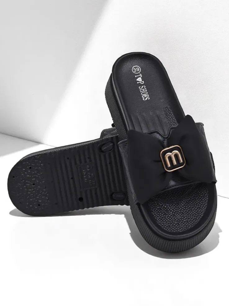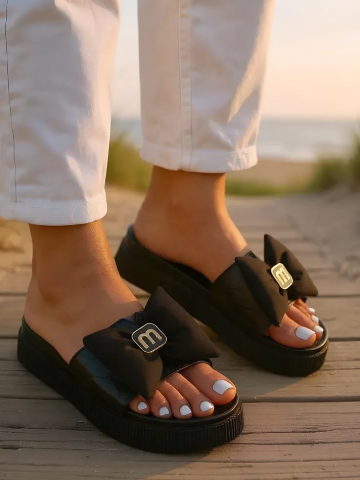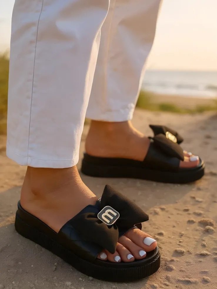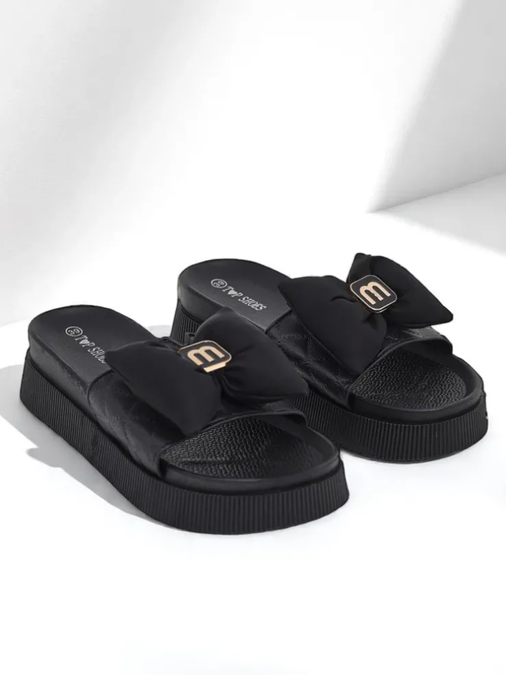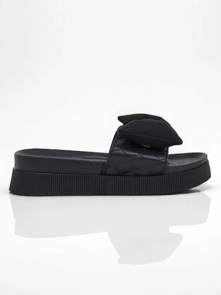 - Klapki damskie na lekkiej, gumowej platformie, idealne na letnie dni. Paseczek z eko skóry ozdobiony uroczą kokardką dodaje dziewczęcego uroku. Wygodne, stylowe i kobiece – świetny wybór na codzienne wyjścia i wakacyjny luz.