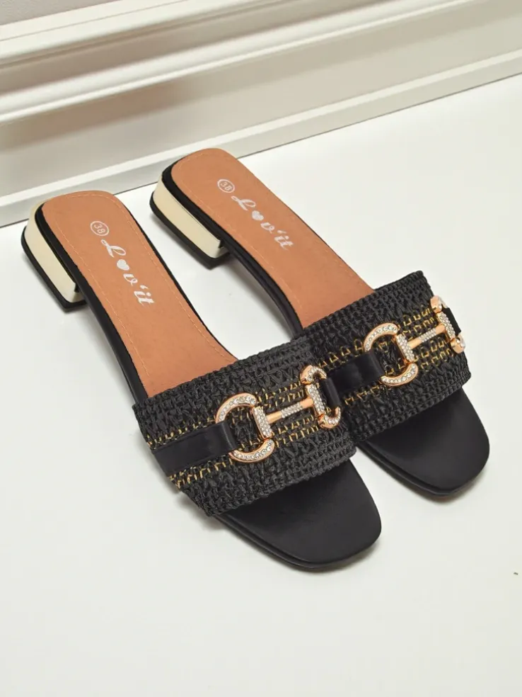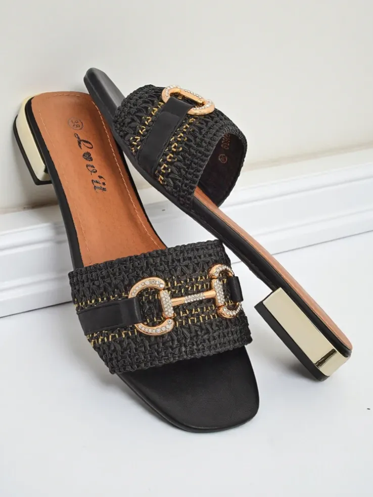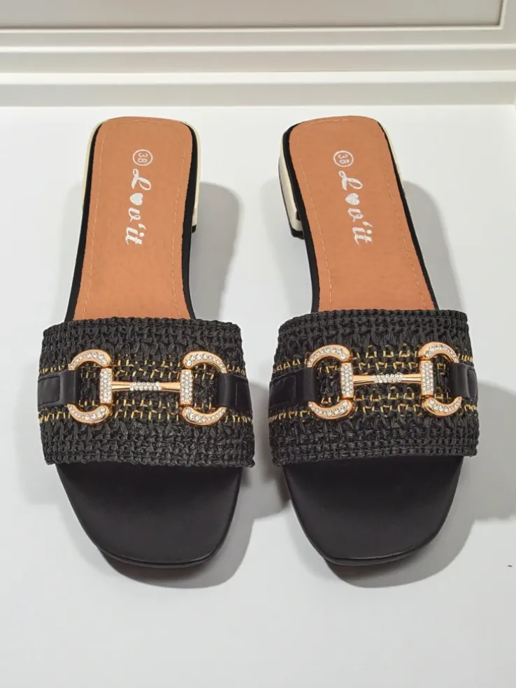 - Damskie klapki na płaskiej podeszwie z wkładką ze skóry ekologicznej, plecionym paskiem z tkaniny i złotą ozdobą. Stylowe i wygodne – idealne na lato i codzienne, swobodne stylizacje.