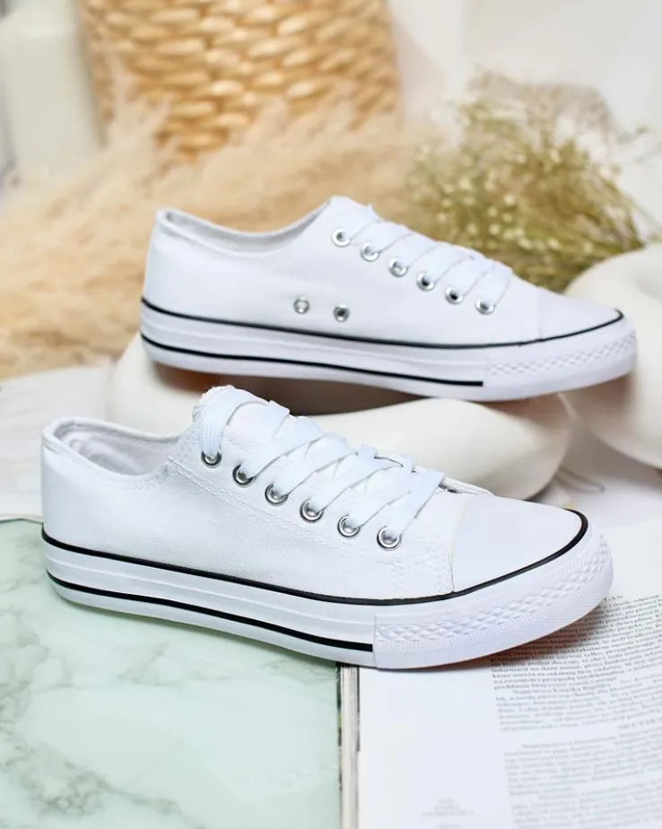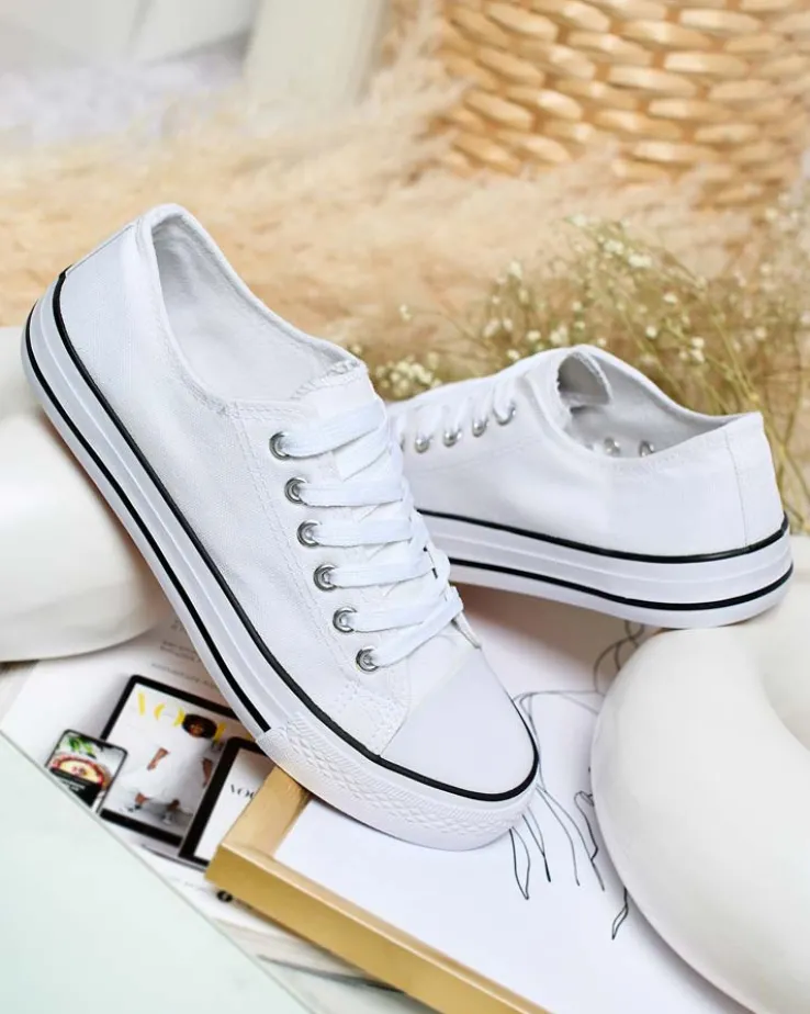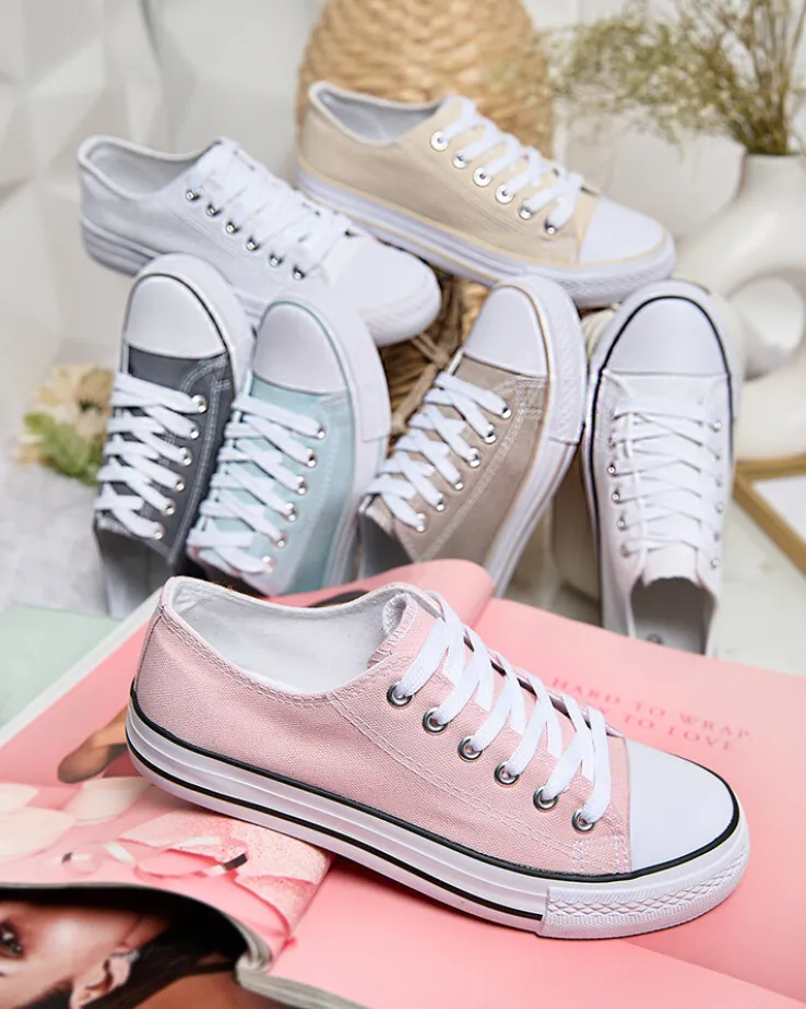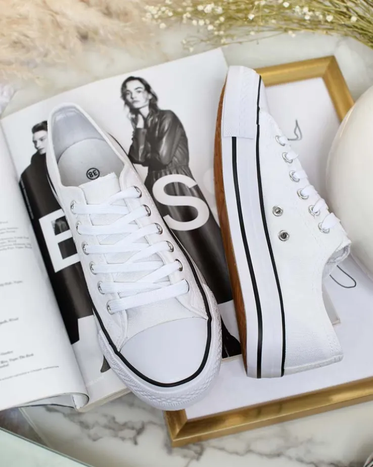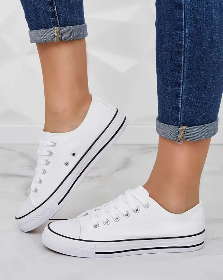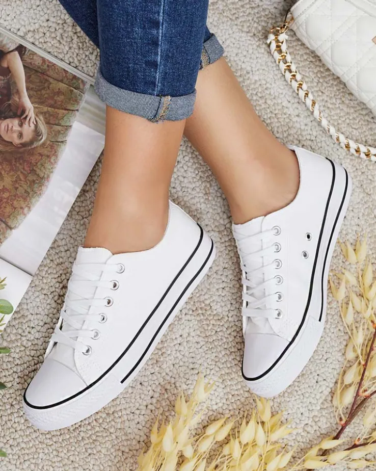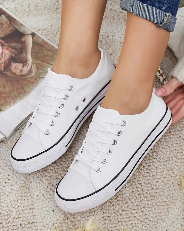 - Klasyczne damskie sznurowane trampki na płaskiej podeszwie. Cholewka jak i wkładka wykonane są z materiału tkaninowego. Super dodatek do Twoich casualowych outfitów!