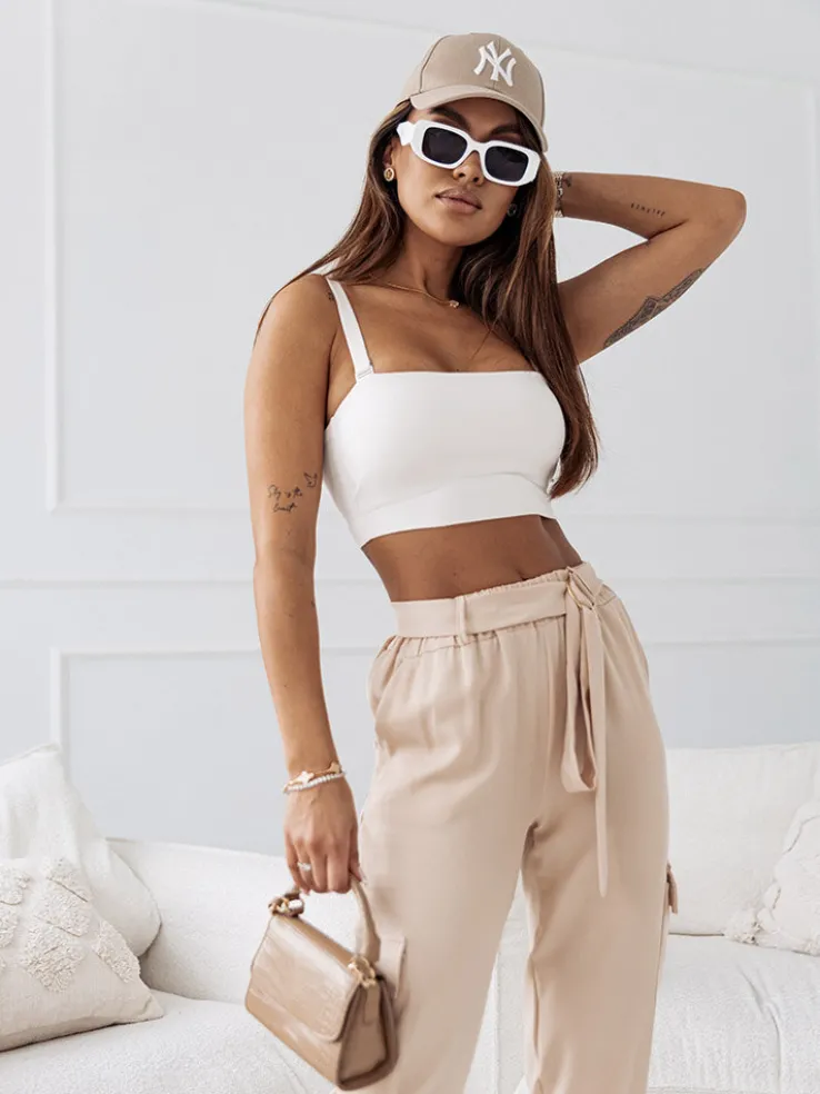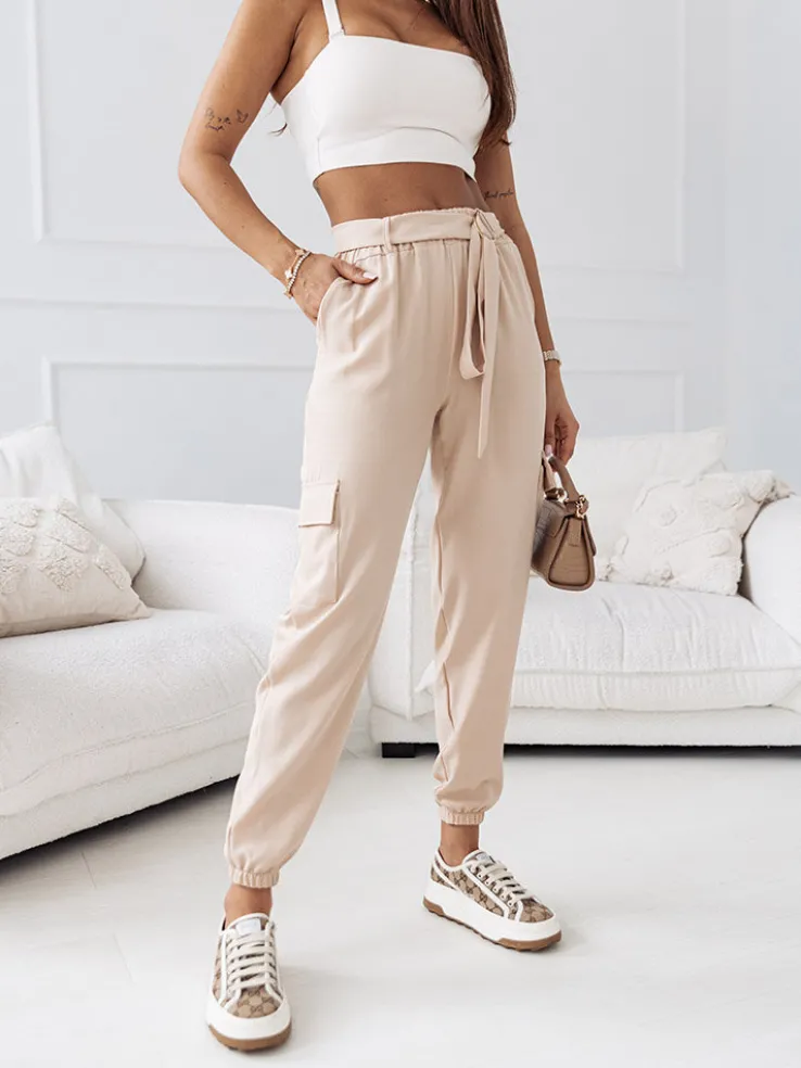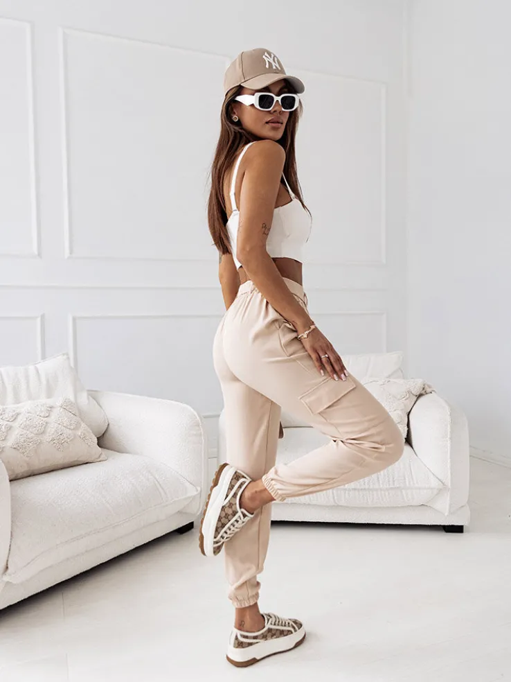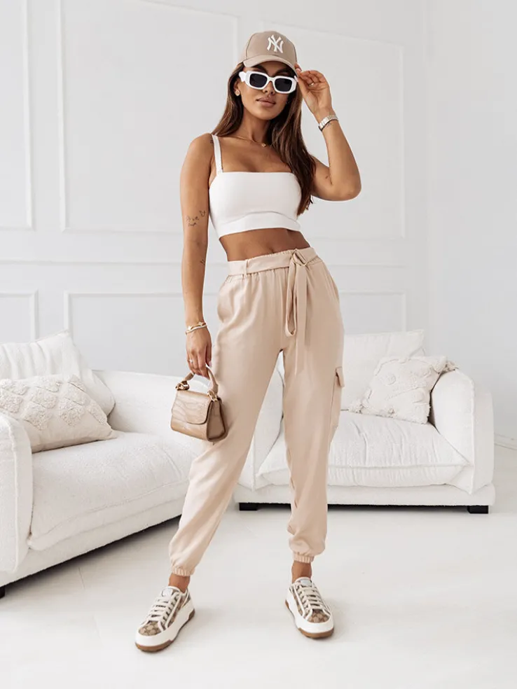 - Wygodne damskie spodnie typu bojówki wykonane z przyjemnej tkaniny. Model posiada 4 kieszenie, w tym też po bokach. Spodnie posiadają gumę i pasek w pasie. Idealny wybór na cieplejsze dni!