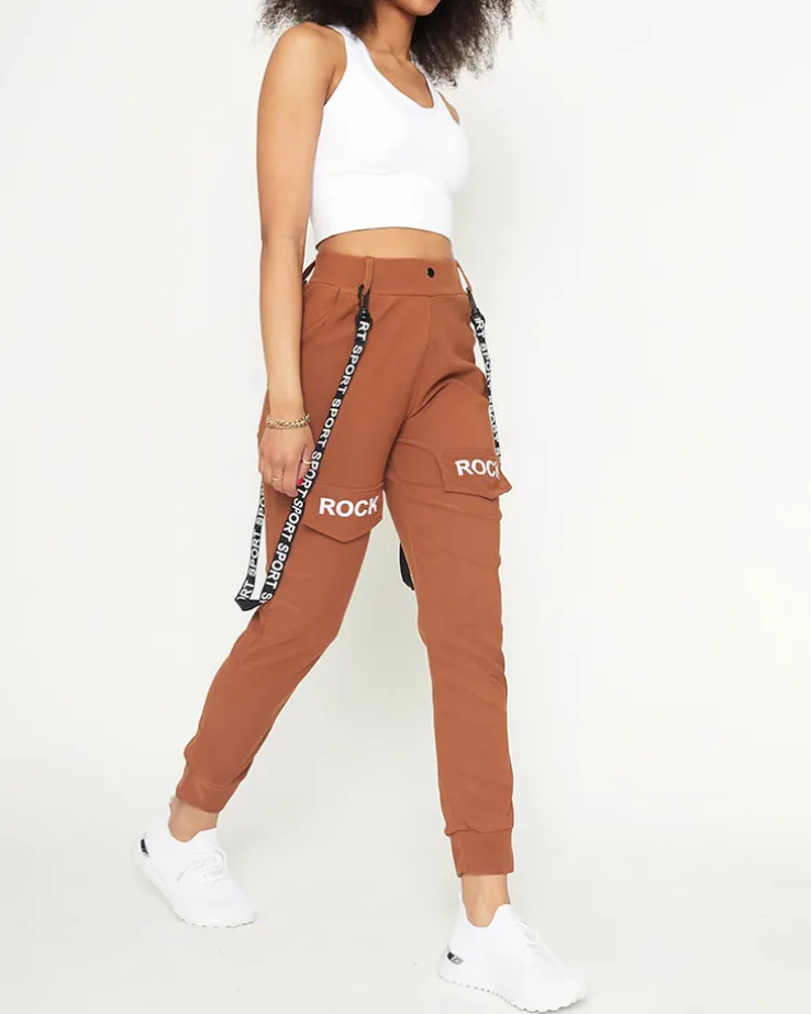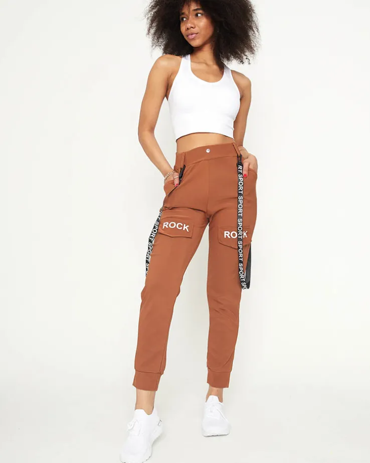- Wyjątkowe damskie spodnie typu bojówki, wykonane z elastycznej tkaniny. Model posiada rozciągliwą gumkę w pasie, dwie wsuwane kieszenie i dwie ozdobne z napisami. Dodatkowo do spodni dołączono ozdobne szelki. UWAGA: Dokładność pomiaru (+/-) 1 cm.