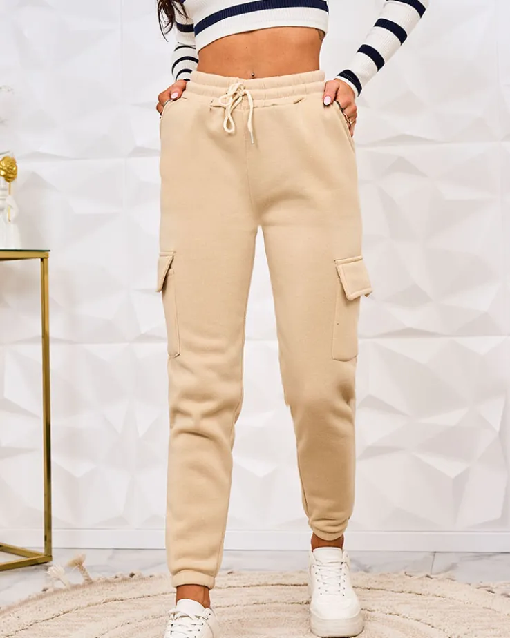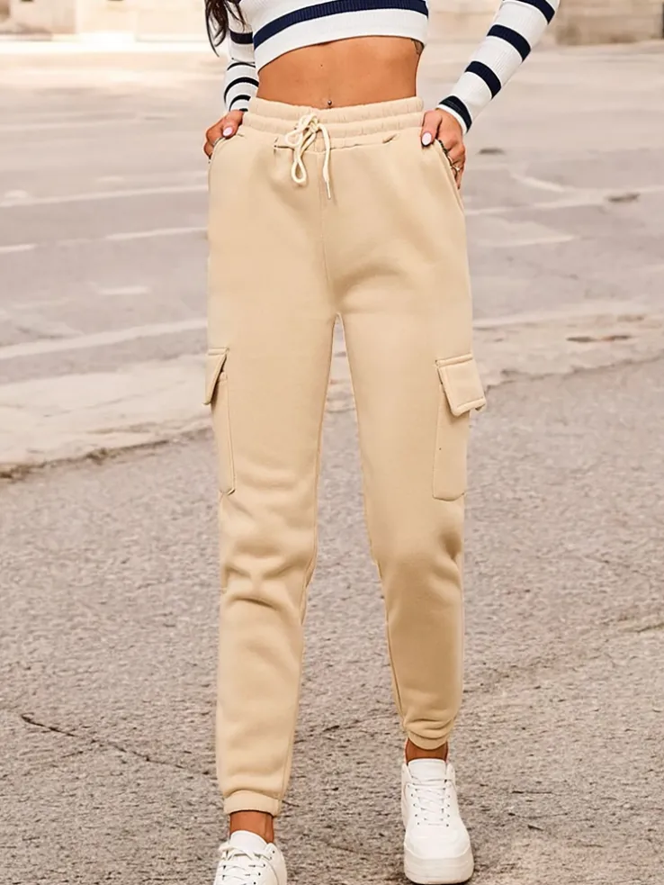 - Wygodne damskie spodnie typu bojówki, wykonane z przyjemnej tkaniny. Model posiada ocieplenie polarem, w pasie szeroka guma i 4 kieszenie. UWAGA: Dokładność pomiaru (+/-) 1 cm. Wymiary mierzone na płasko.