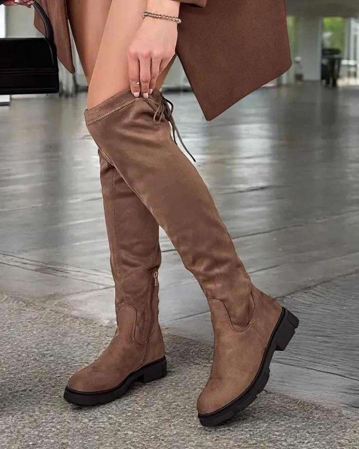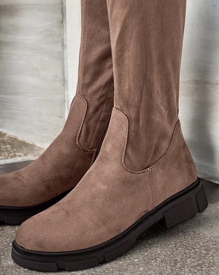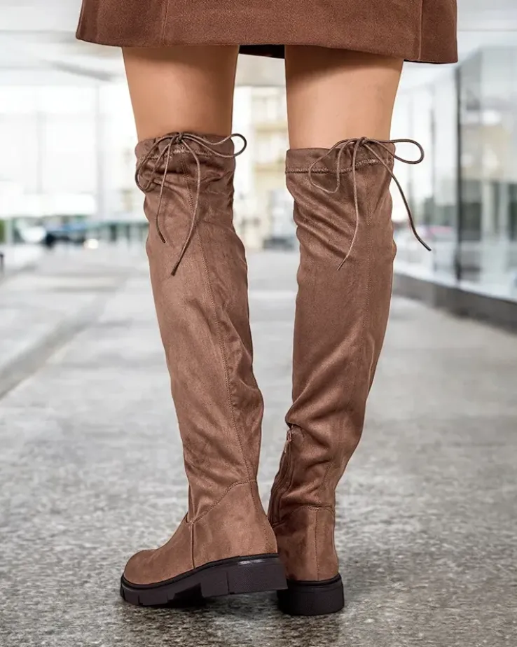 - Stylowe damskie kozaki do kolana na płaskiej podeszwie. Cholewka wykonana jest z elastycznego materiału tkaninowego, w środku tkaninowa wkładka. Model wsuwany. Idealne do codziennych jesiennych outfitów!