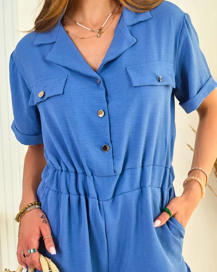 - Rewelacyjny kombinezon damski z krótkimi rękawami, dekoltem w serek z ozdobnym kołnierzykiem oraz gumką w talii. Model posiada szerokie, długie nogawki. UWAGA: Dokładność pomiaru (+/-) 1 cm.