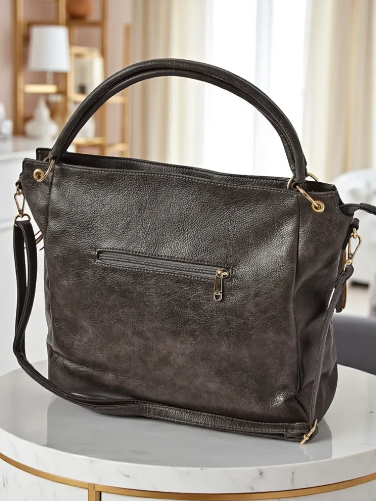 - Stylowa shopperka z eko skóry z 1 komorą, 4 kieszeniami wewnętrznymi i 1 zewnętrzną. Ozdobne boczne kieszonki na suwak z frędzelkami dodają charakteru. Z odpinanym, regulowanym paskiem – idealna na co dzień.