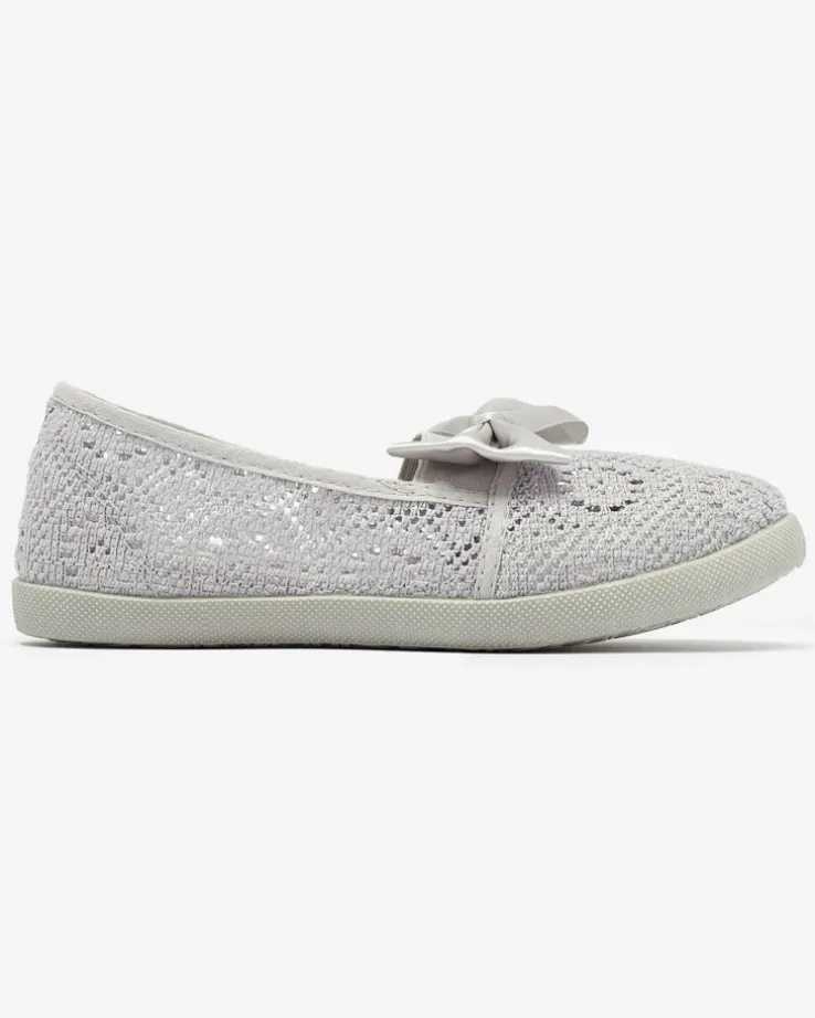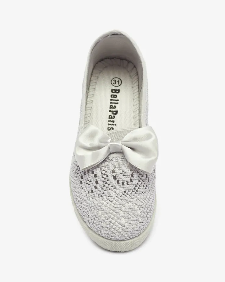 - Dziecięce tenisówki typu slip on wykonane z tkaniny o koronkowym wykończeniu. Cholewka zdobiona satynową wstążką. Świetne buty dziecięce do wielokolorowej sukienki!
