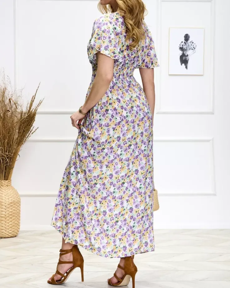 - Świetna damska sukienka o długości midi, wykonana z kwiecistej, bawełnianej tkaniny. Model z kopertowym dekoltem, posiada krótkie rękawy i szeroką gumę podkreślającą talię. Niezbędny element garderoby! UWAGA: Dokładność pomiaru (+/-) 1 cm.