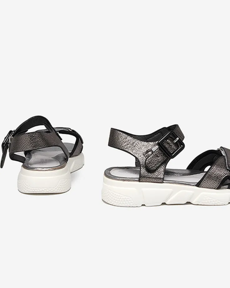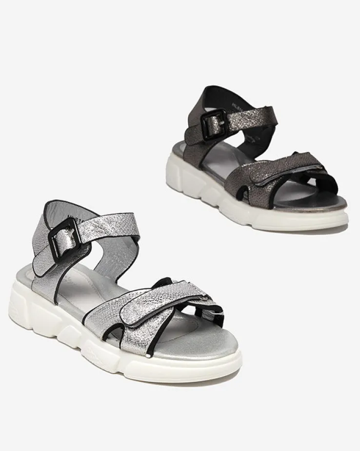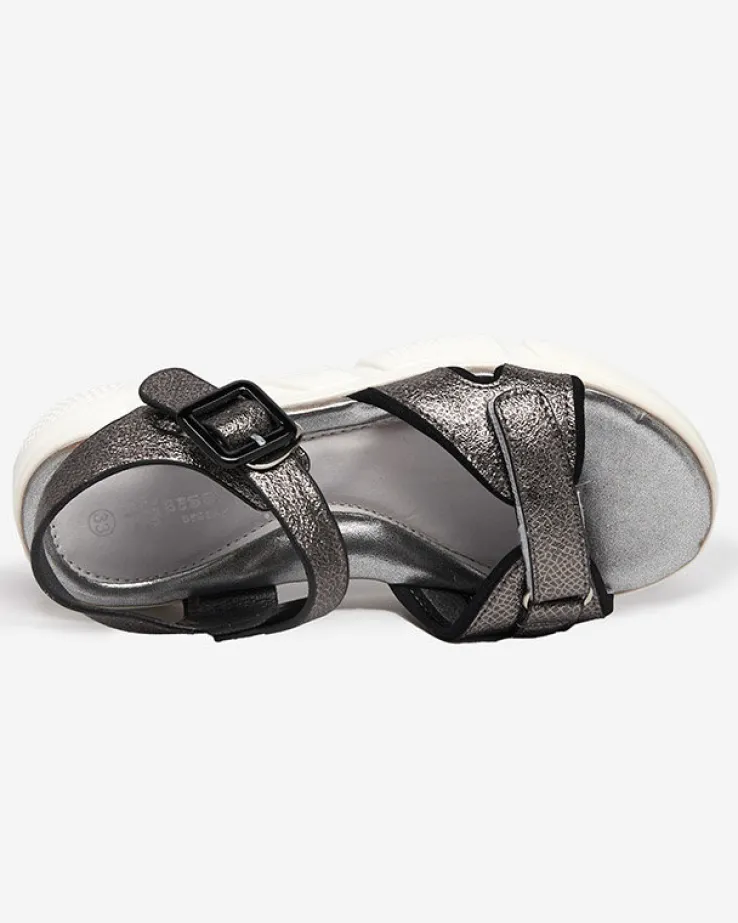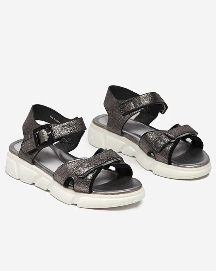- Efektowne dziewczęce sandały na płaskiej podeszwie, wykonane z błyszczącej tkaniny. Obuwie zapinane na klamrę wokół kostki oraz rzep na nosku. W środku miękka, eko skórzana wkładka. Idealne na upalne dni!