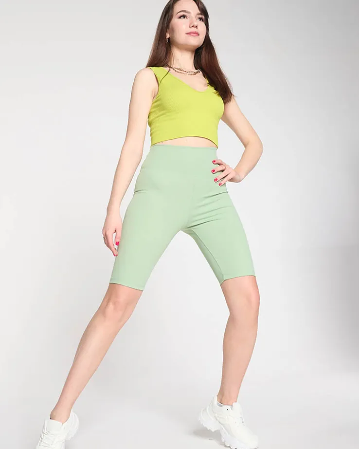 - Damskie krótkie spodenki treningowe typu kolarki, wykonane z grubej tkaniny prążkowanej. Model z wysokim stanem oraz gumką w pasie. Sprawdzą się doskonale na rower!