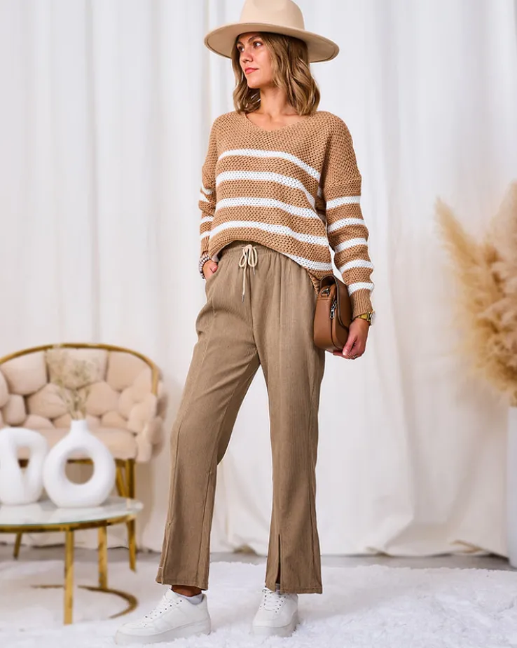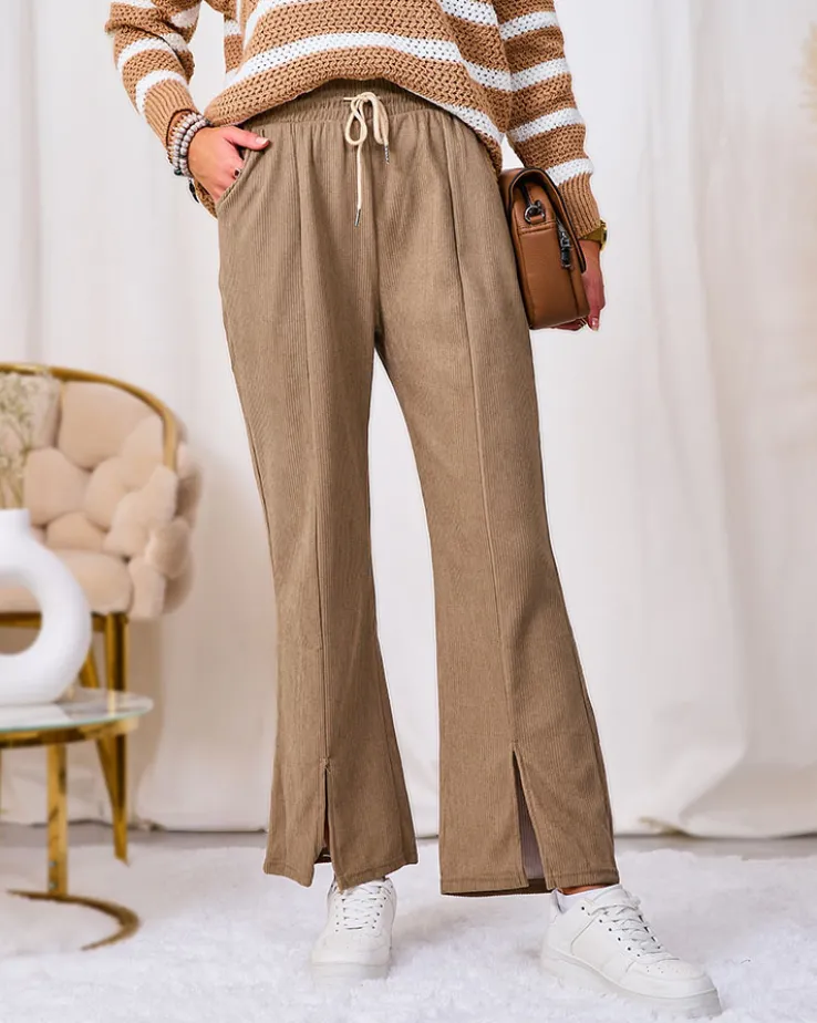 - Rewelacyjne szerokie spodnie damskie z materiału typu sztruks. Model posiada elastyczną gumę w pasie z regulowanymi troczkami. Dodatkowo, dwie wsuwane kieszenie z przodu. Hit tego sezonu!