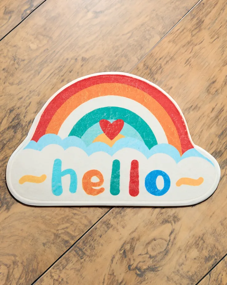 - Mały kolorowy dywanik wycieraczka z krótkim włosiem i napisem ” Hello”. Jest miękki i delikatny, przez co niezwykle przyjemny w dotyku. Dodatkowym atutem dywanu jest jego antypoślizgowy spód.