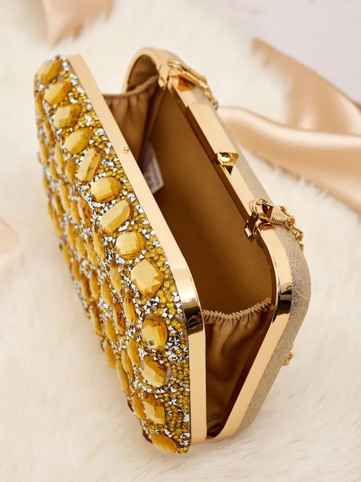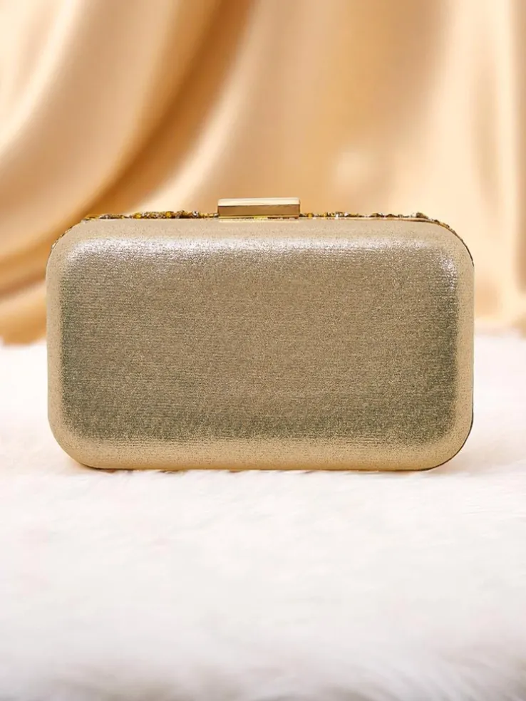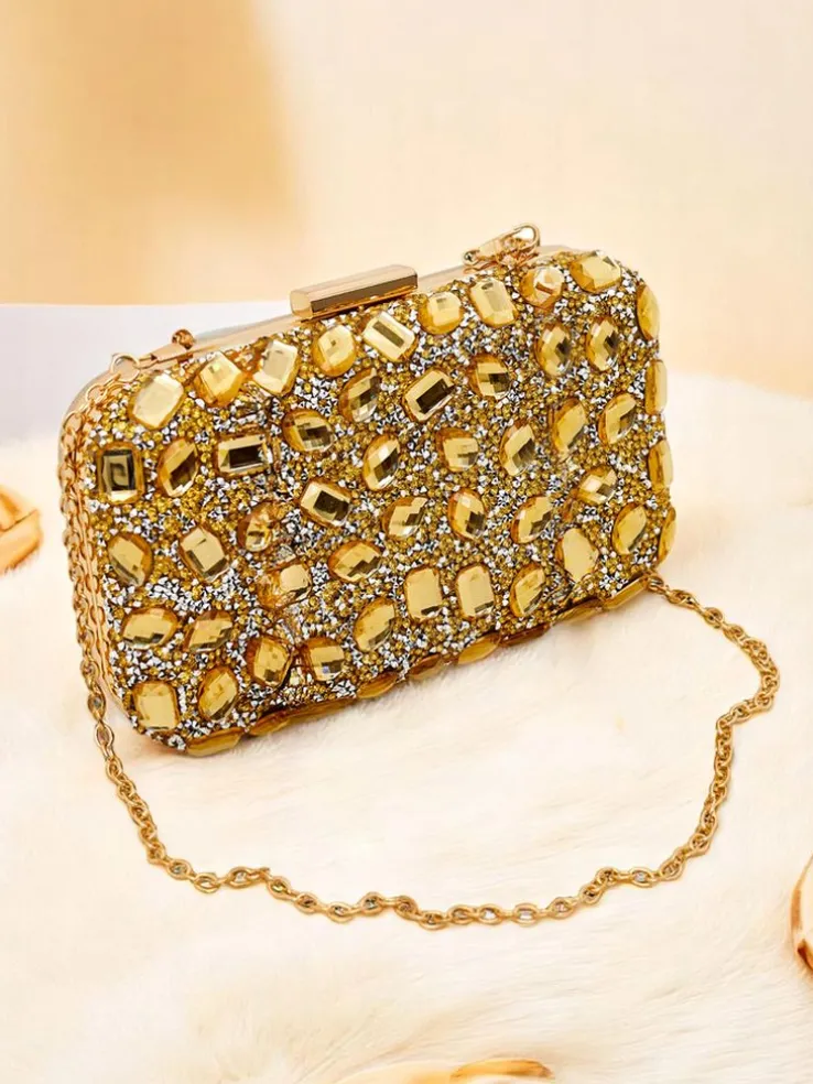 - Olśniewająca kopertówka z eko skóry, pokryta tkaniną z grubym brokatem i kamieniami. Zapinana na zatrzask, z odpinanym łańcuszkiem — pełnia blasku na wielkie wyjścia.