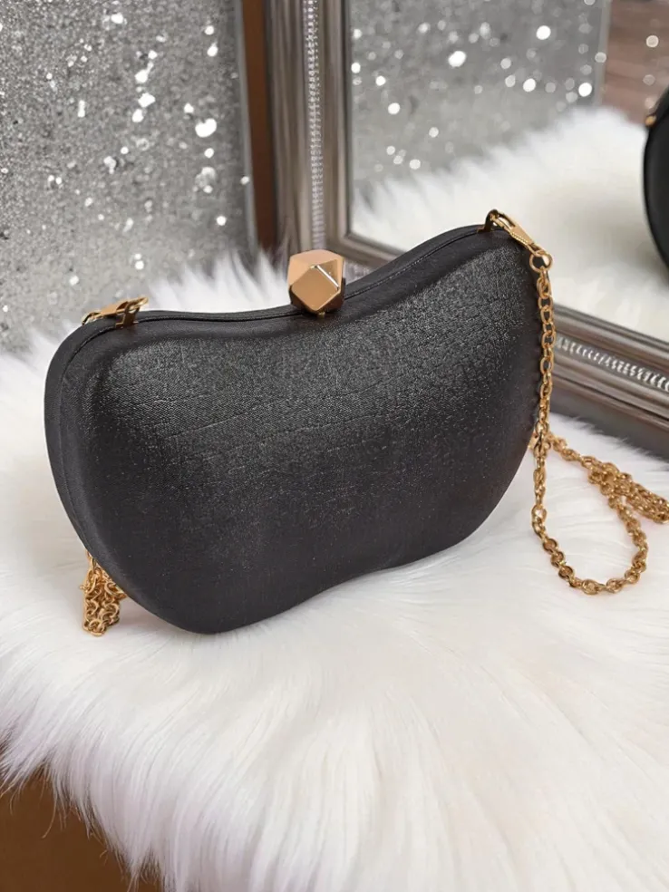 - Unikalna kopertówka w kształcie jabłka z eko skóry, pokrytej połyskującą tkaniną z tłoczeniem. Zapinana na zatrzask, z odpinanym łańcuszkiem — idealna na wyjątkowe okazje.
