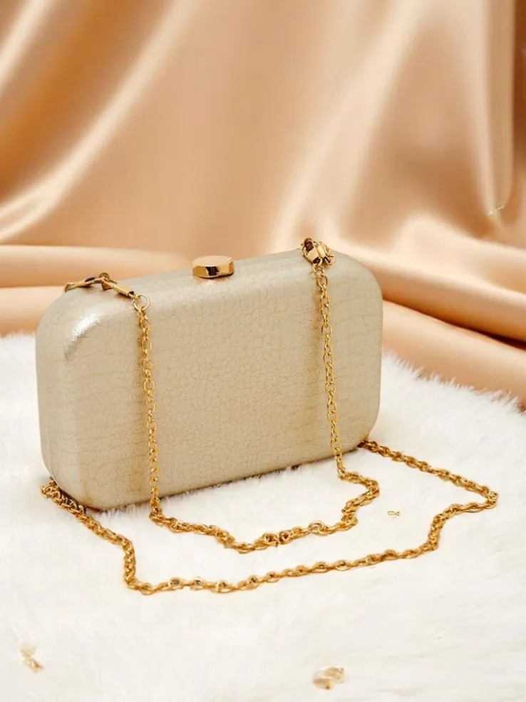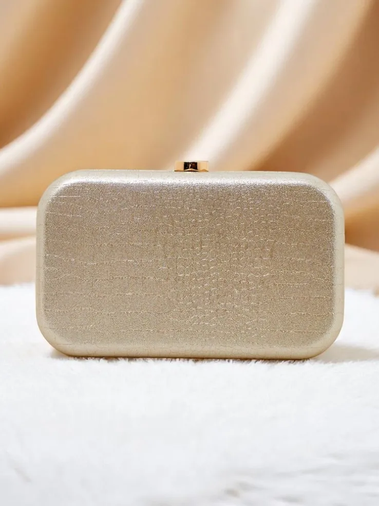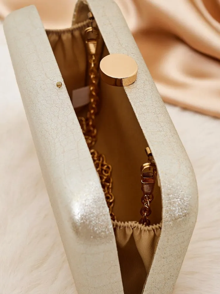 - Kopertowa torebka z eko skóry, pokryta tkaniną z połyskującą nicią i subtelnym tłoczeniem. Zapinana na zatrzask, z odpinanym łańcuszkiem — elegancja i blask w jednym.