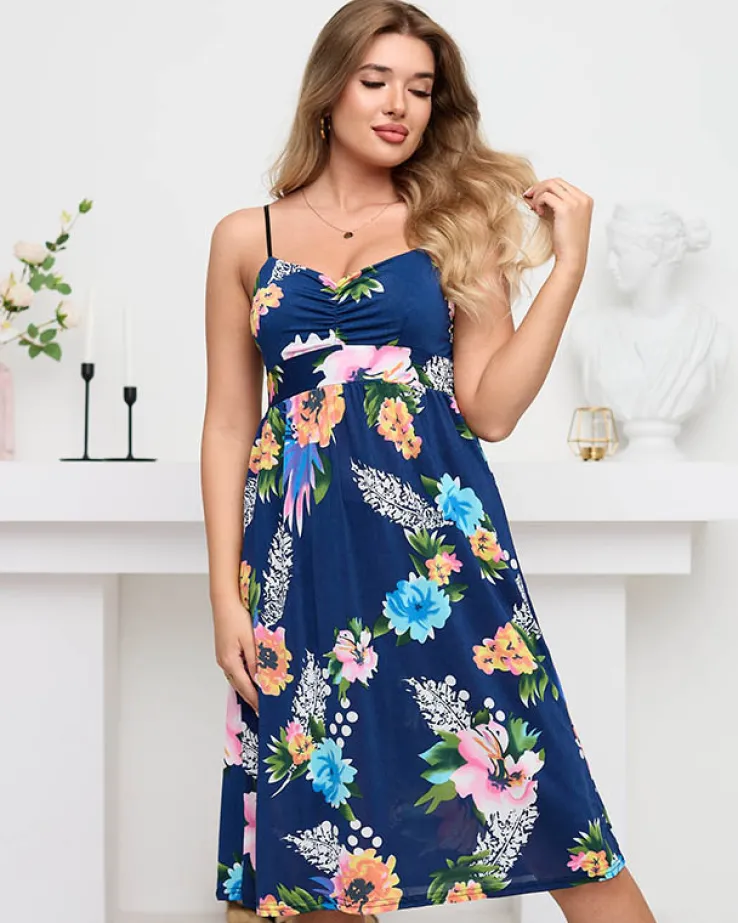- Sukienka do kolan z kwiatowym motywem. Model o luźnym kroju, posiada odcięcie w pasie z gumką oraz regulowane ramiączka. Doskonała sukienka na lato! UWAGA: Dokładność pomiaru (+/-) 1 cm.