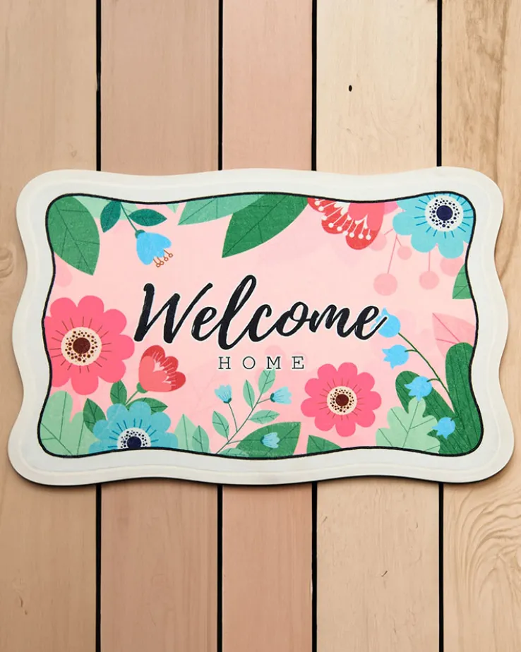 - Mały kolorowy dywanik wycieraczka z krótkim włosiem we wzór w kwiaty. Jest miękki i delikatny, przez co niezwykle przyjemny w dotyku. Dodatkowym atutem dywanu jest jego antypoślizgowy spód.
