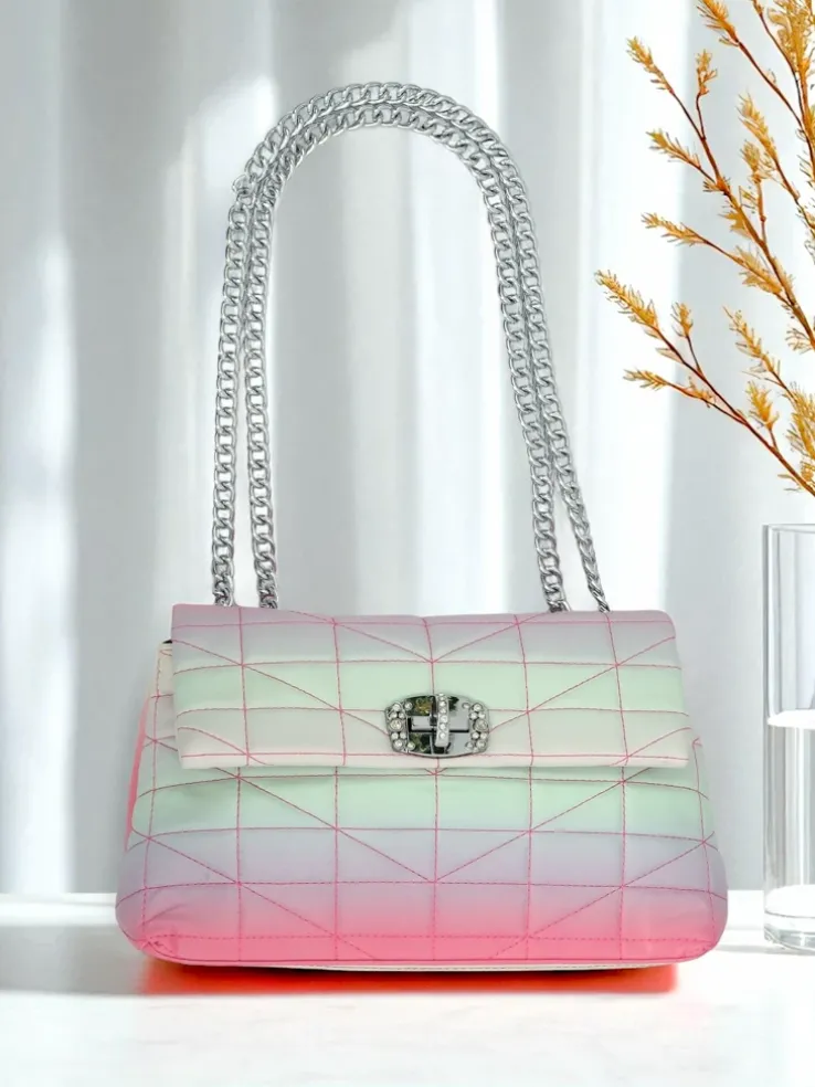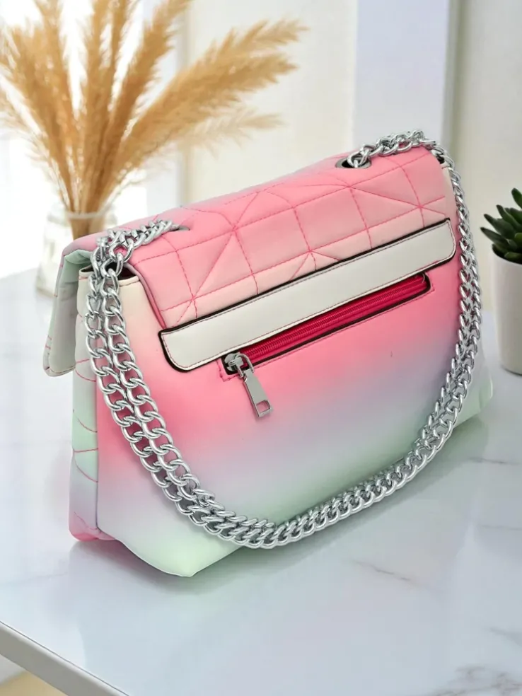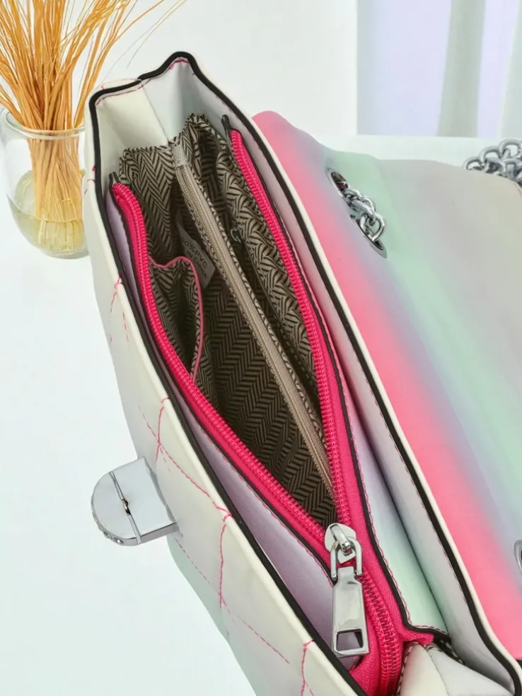- Elegancka kopertowa torebka z eko skóry z efektem ombre. Zamykana na zamek i zatrzask. Metalowy łańcuszek zamiast paska dodaje szyku. 1 komora idealna na najważniejsze rzeczy na wieczór i specjalne okazje.