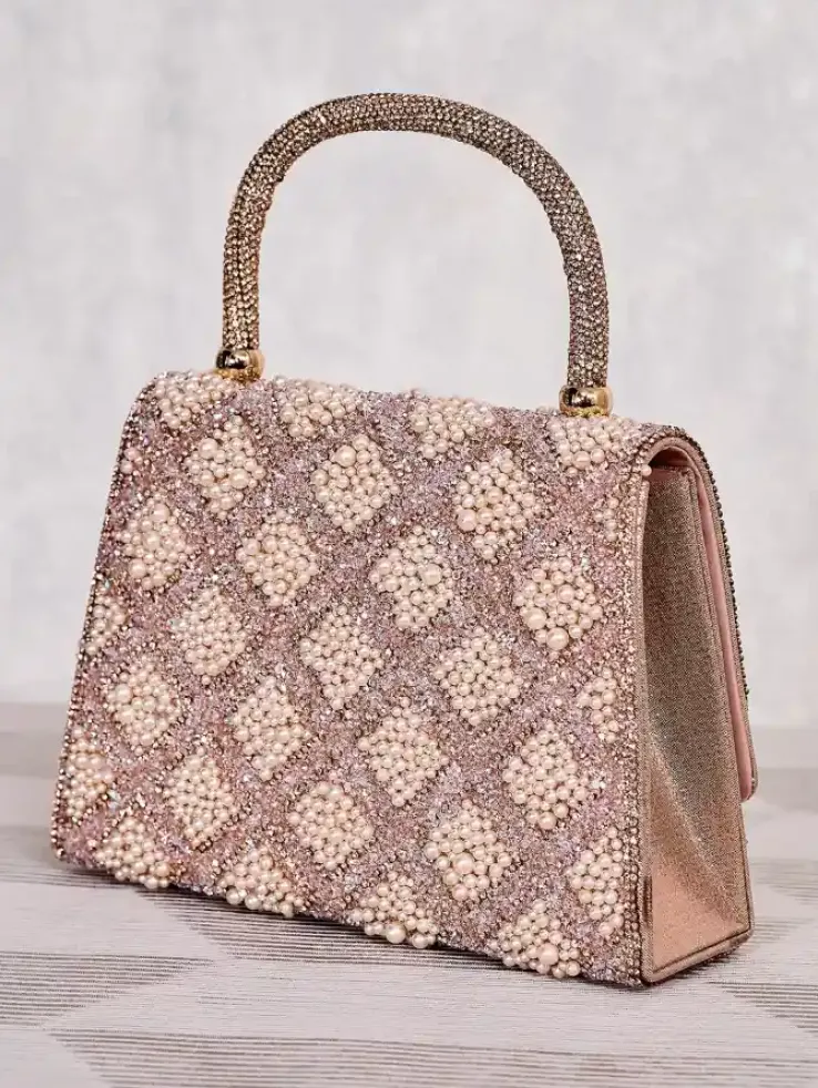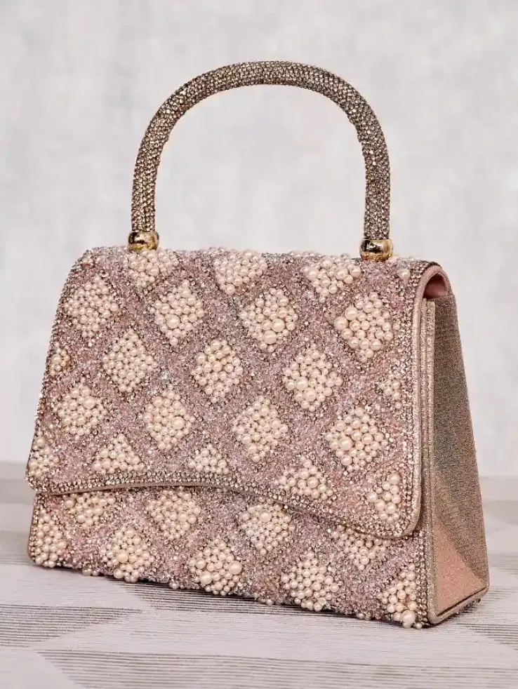 - Elegancka mała torebka damska zdobiona cyrkoniami i perełkami. Model z zapięciem na magnez, posiada 1 komorę i 1 kieszonkę, rączki oraz łańcuszek na ramię. Idealna na oficjalne wyjścia!