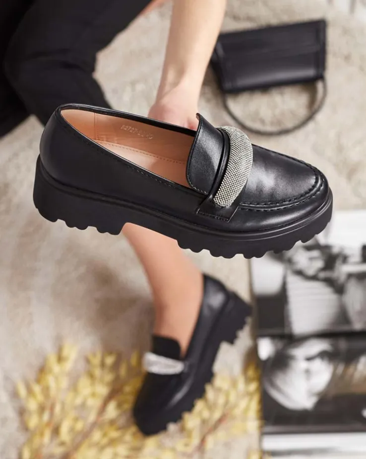 - Klasyczne damskie mokasyny na płaskiej podeszwie. Model jest wykonany ze skóry ekologicznej zamszowej i eko skórzanej wkładki. Posiada cyrkonie i okrągły nosek. Idealna baza na co dzień!