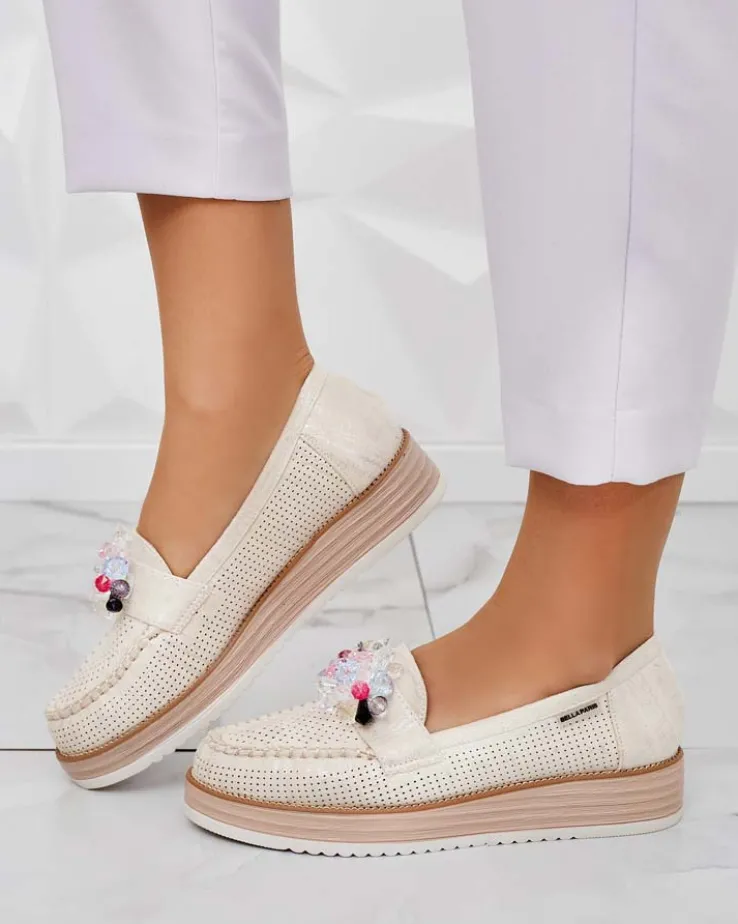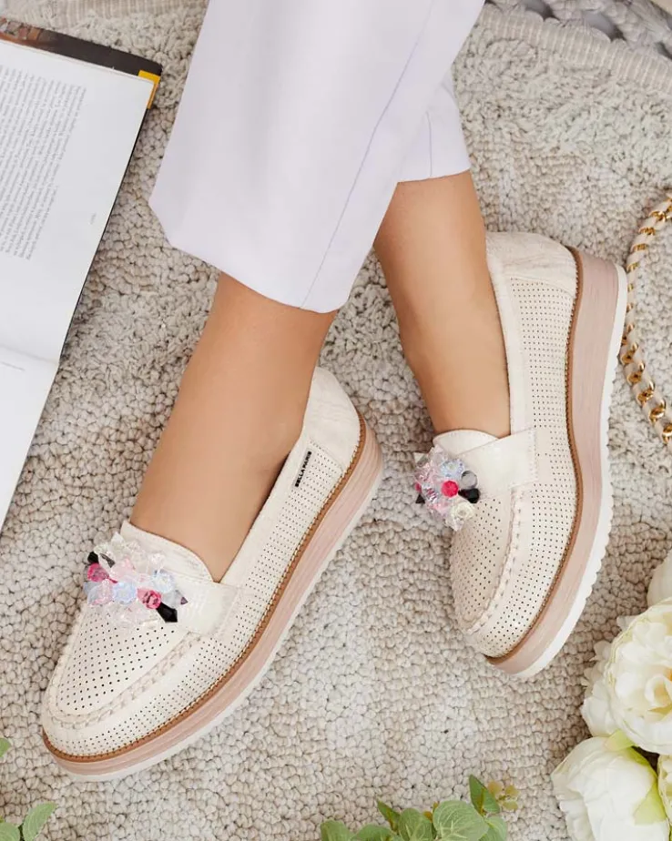 - Przepiękne damskie mokasyny na grubszej podeszwie. Model w tylu casual i jest wykonany ze skóry ekologicznej zamszowej z ażurowymi wstawkami, wkładka to skóra naturalna. Na nosku ozdoba z kolorowymi kamyczkami. Idealna baza dla wielu codziennych looków!