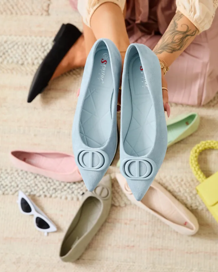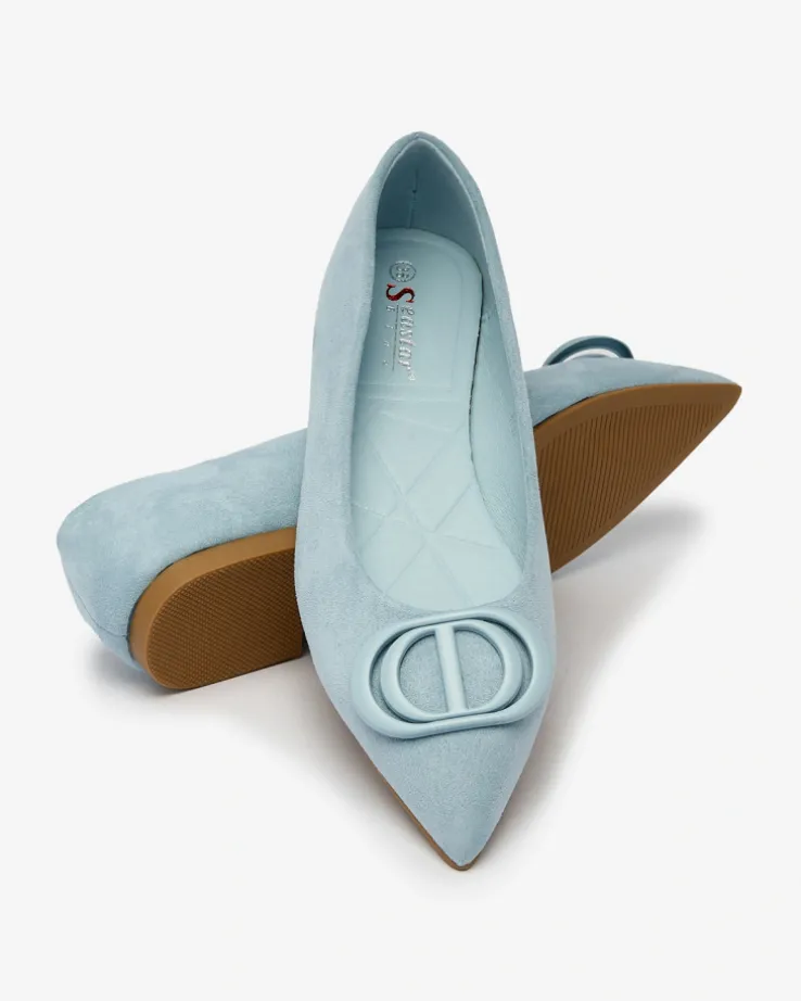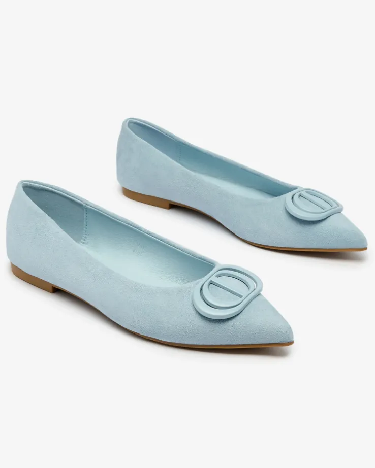 - Balerinki damskie na płaskim obcasie w całości wykonane ze skóry ekologicznej zamszowej. Nosek w szpic i zdobiony metalową klamrą. Super dodatek do Twoich casualowych outfitów!