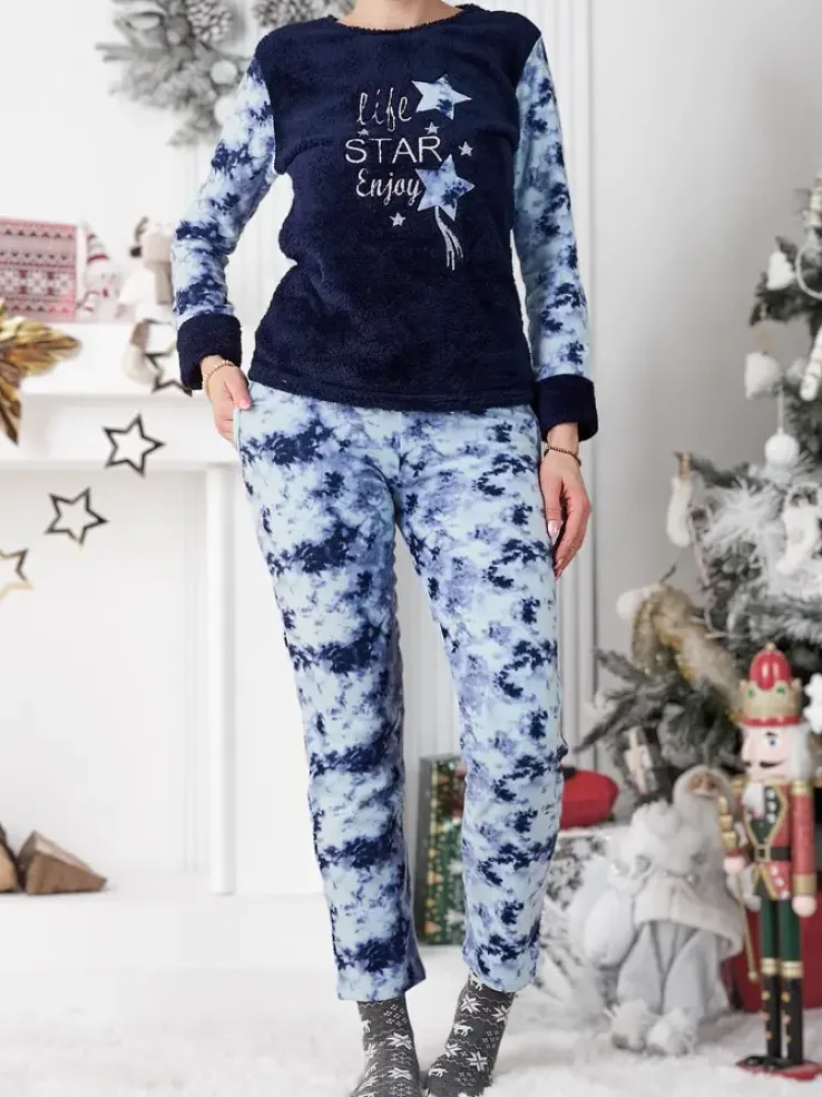 - Piżama damska 2-częściowa z długim rękawem i długimi nogawkami, wykonana z materiału a’la polar. Model zdobiony printem. Idealna na domowe wieczory! UWAGA: Dokładność pomiaru (+/-) 1 cm.