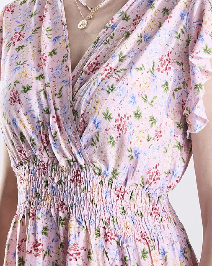 - Lekka damska sukienka wykonana z tkaniny z kwiatowym wzorem. Model z kopertowym dekoltem, posiada gumę w talii oraz krótkie rękawy. Idealna do sandałów! UWAGA: Dokładność pomiaru (+/-) 1 cm.