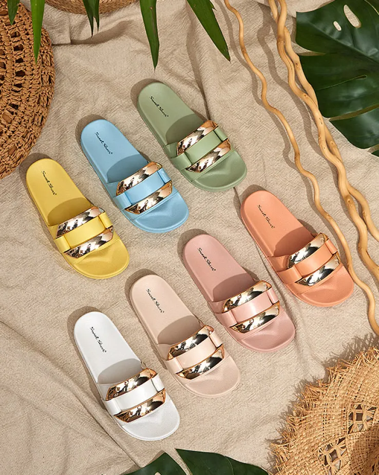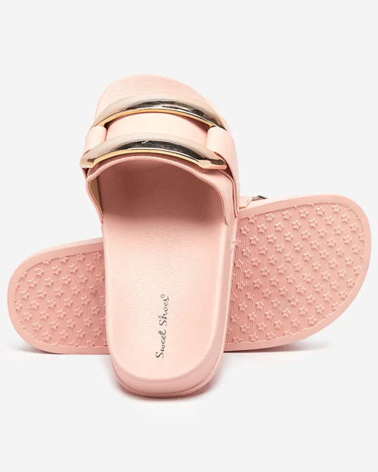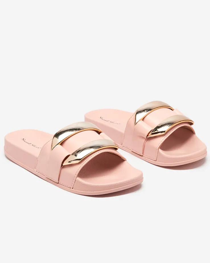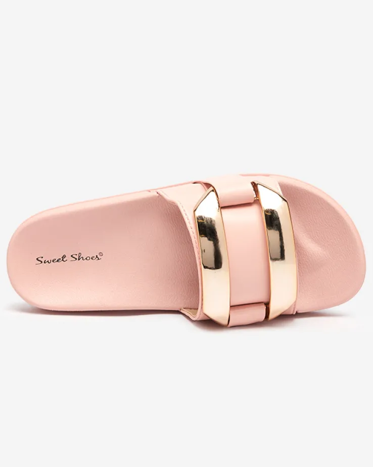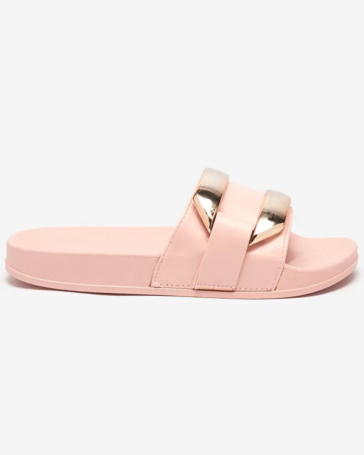 - Stylowe damskie klapki na płaskiej podeszwie, wykonane ze skóry ekologicznej. Model z dużą plastikową ozdobą w złotym kolorze, posiada wkładkę i podeszwę z tworzywa gumowego. UWAGA: model może posiadać delikatne zarysowania na cholewce.