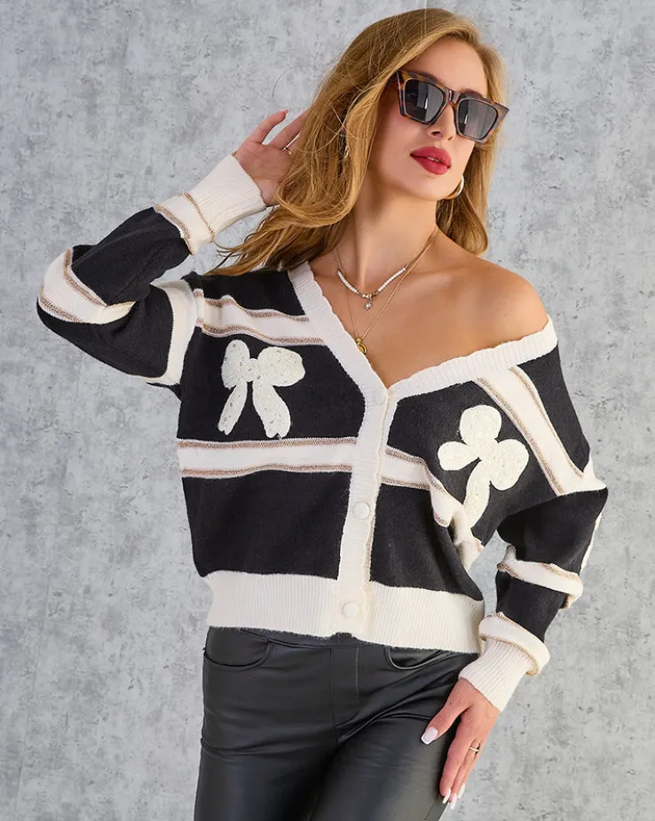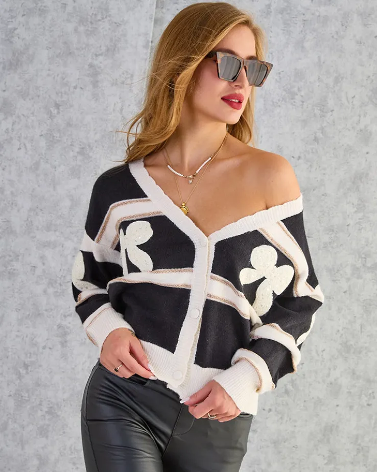 - Ten wyjątkowy, krótszy sweter to esencja wygody i uroku. Wykonany z miękkiego materiału, sweter posiada długie rękawy, guziki oraz ozdobne naszywki z cyrkoniami.