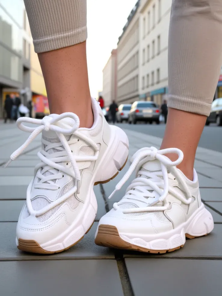 - Damskie buty sportowe wykonane ze skóry ekologicznej i siateczki. Model na grubszej podeszwie. Cholewka sznurowana. Będą świetnie pasowały do codziennych stylizacji!