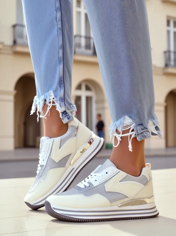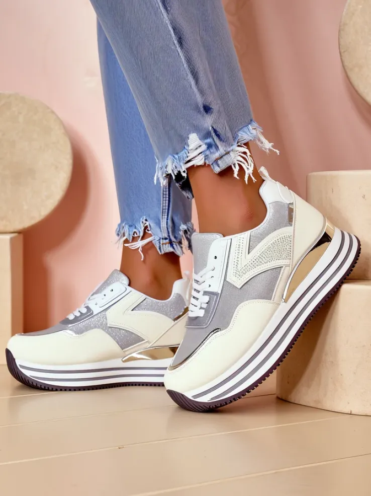 - Damskie buty sportowe typu sneakersy na grubszej podeszwie. Wykonane ze skóry ekologicznej i materialu brokatowego oraz tkaninowej wkładki. Super dodatek do twoich codziennych outfitów w stylu casual!
