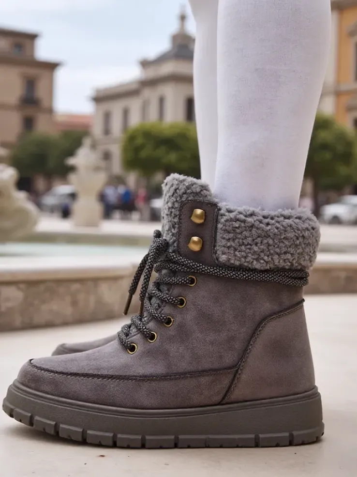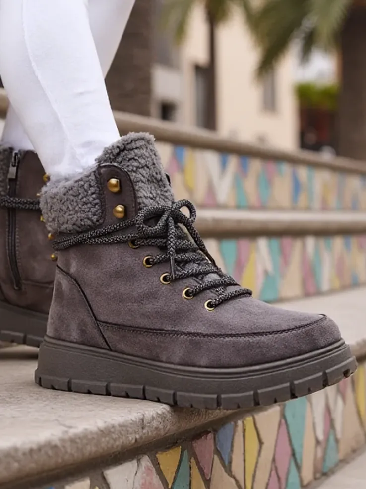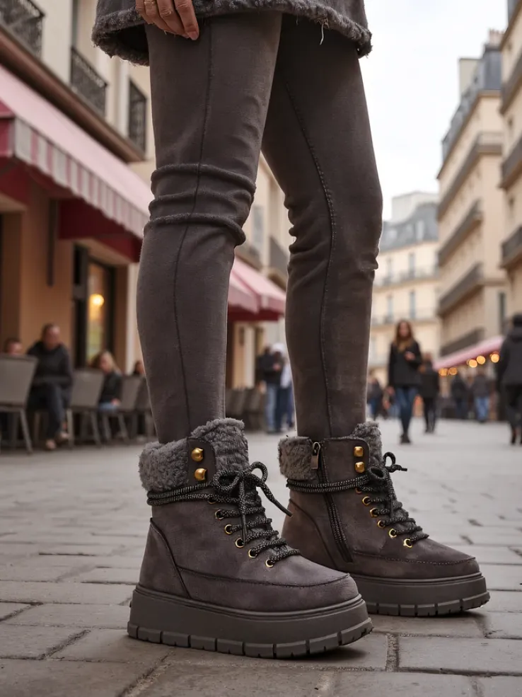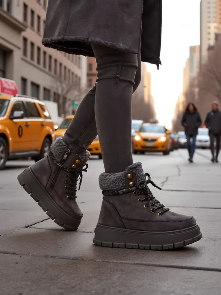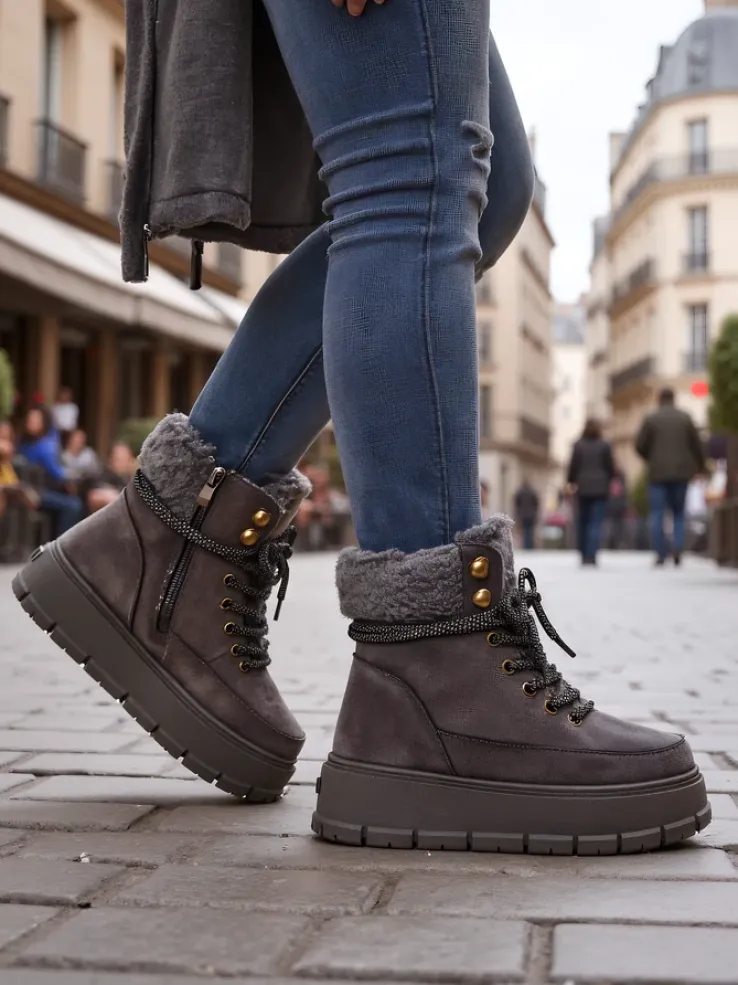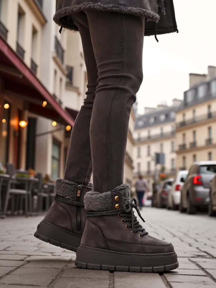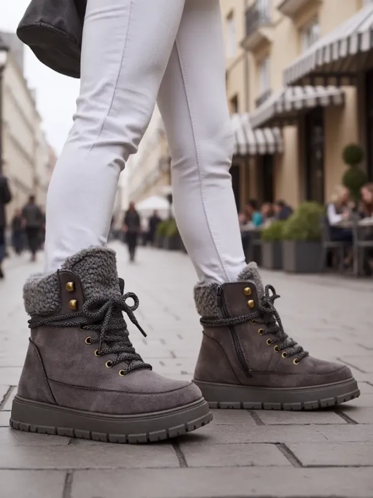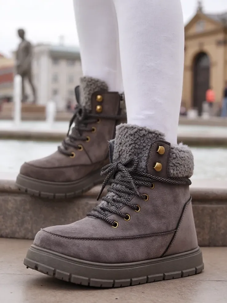 - Ponadczasowe damskie obuwie typu śniegowce na grubej podeszwie. Cholewka wykonana z zamszowej eko skóry. W środku ocieplenie w formie futerka, obuwie sznurowane oraz zapinane na suwak. Idealne na chłodniejszą porę roku!