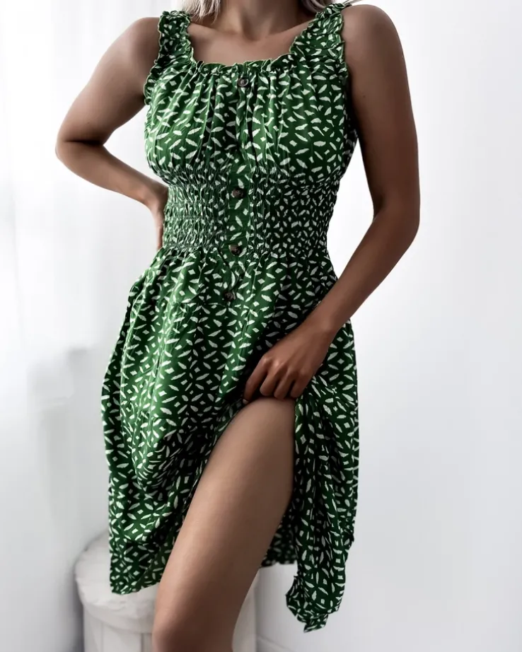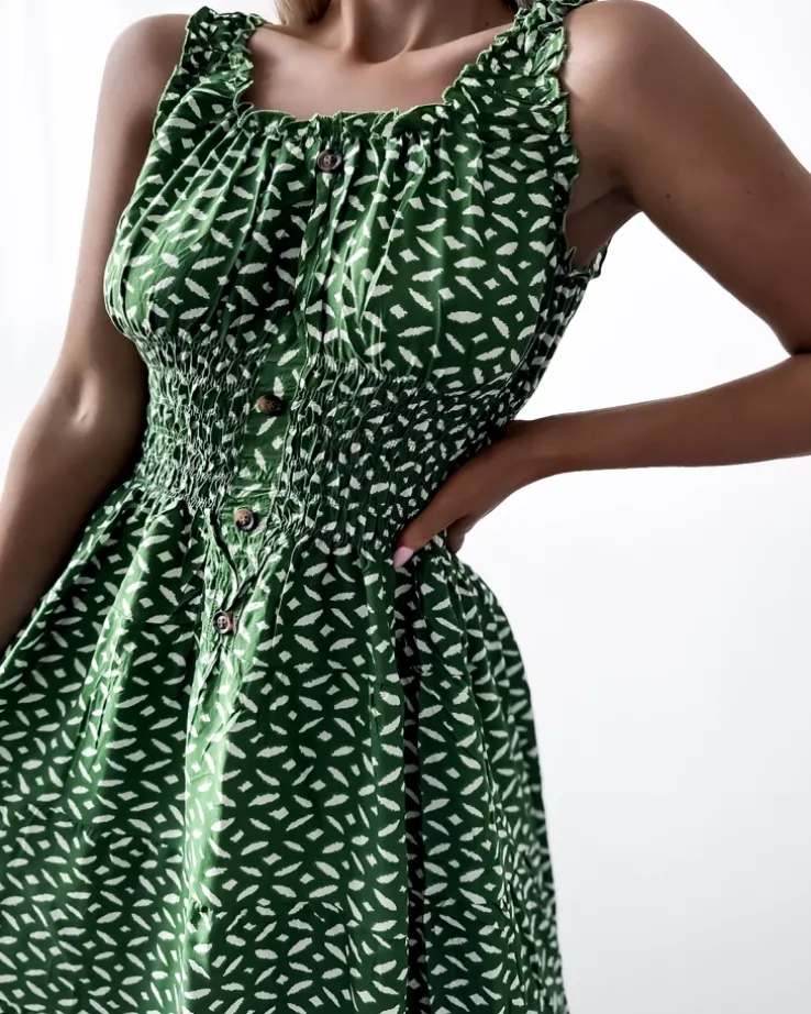 - Damska sukienka za kolano, wykonana z lekkiej tkaniny zdobionej printem. Model z okrągłym dekoltem oraz gumą na szerokość talii. Model na ramiączkach. Świetna na lato! UWAGA: Dokładność pomiaru (+/-) 1 cm.