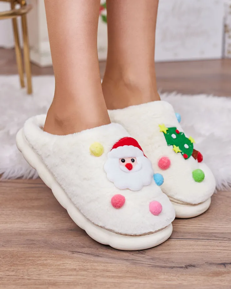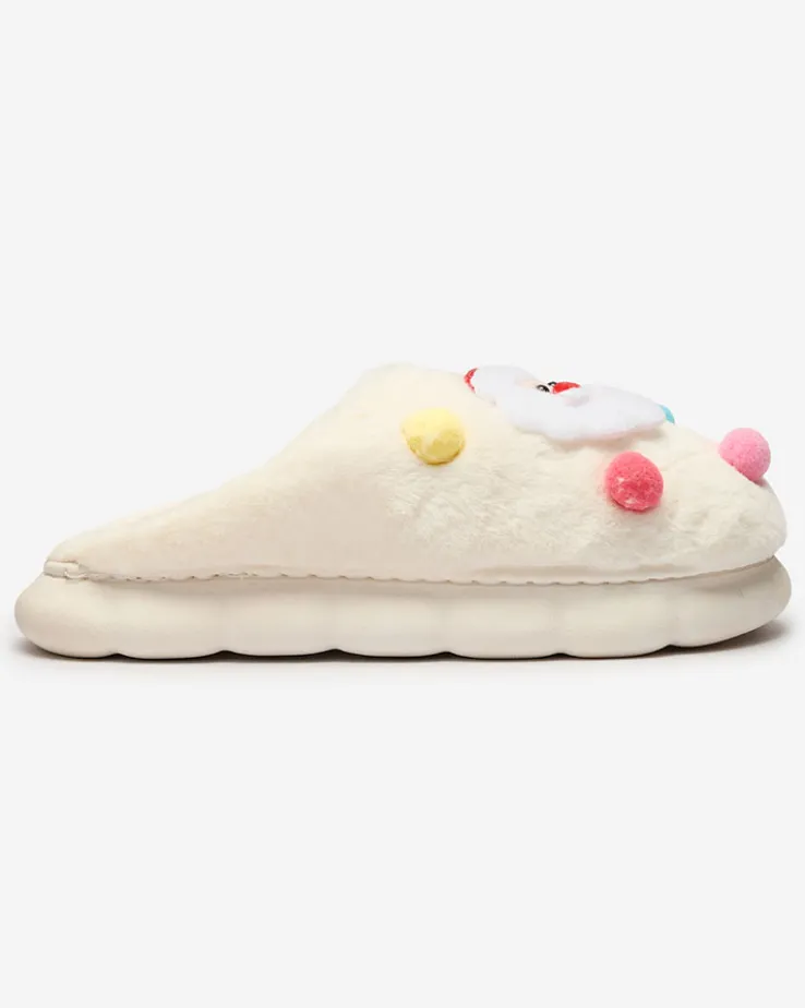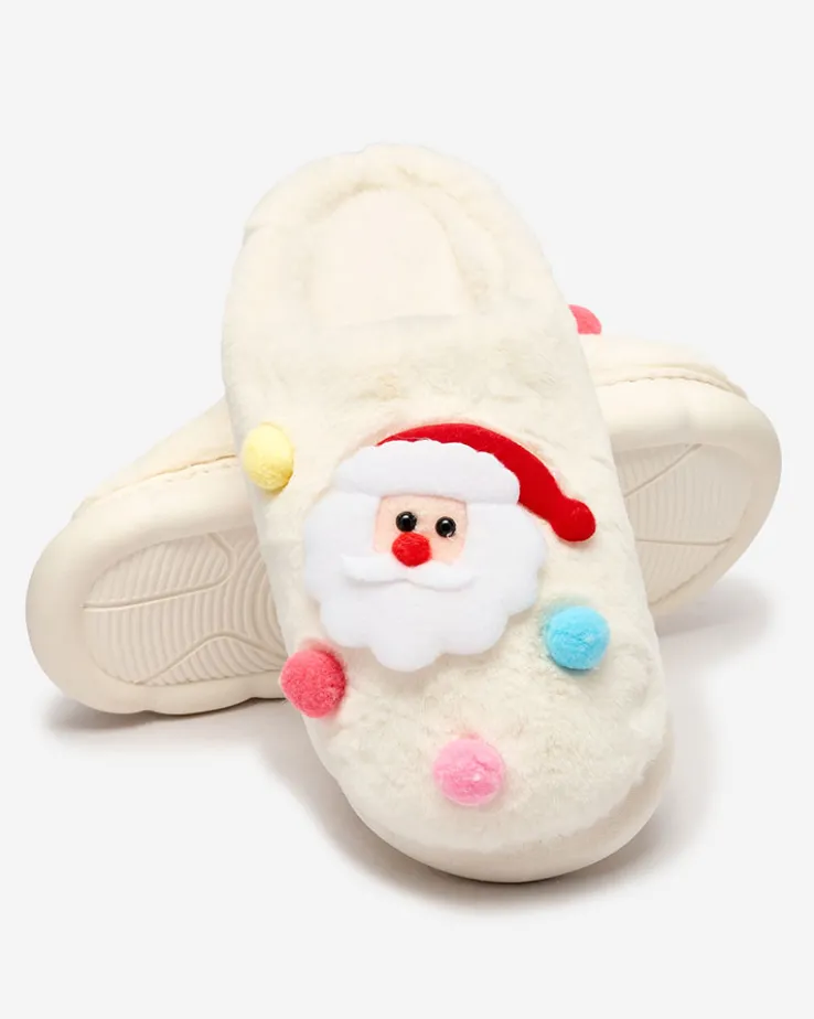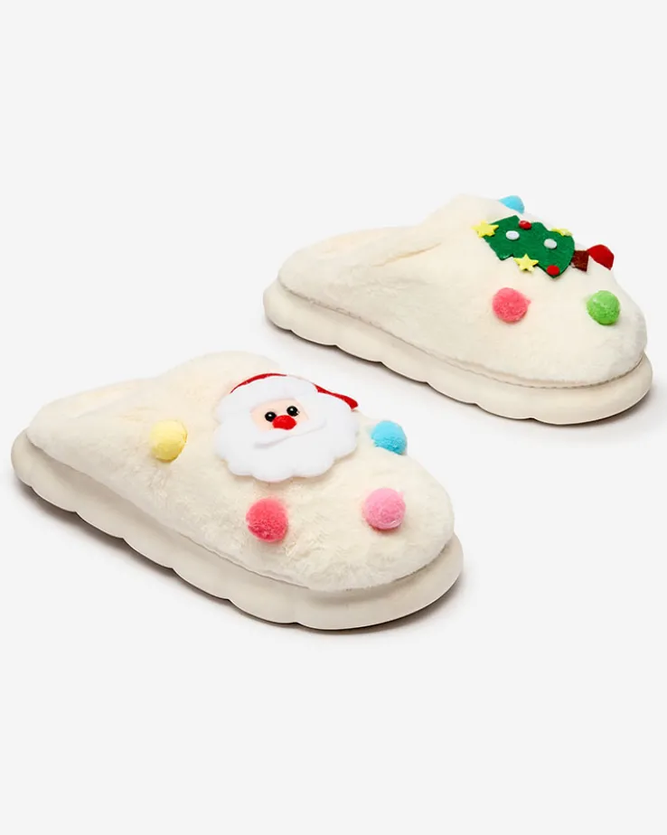 - Śliczne damskie kapcie na płaskiej podeszwie, zdobione świątecznymi naszywkami. Model wykonany z materiału imitującego futerko. Świetna propozycją dla domowych outfitów!