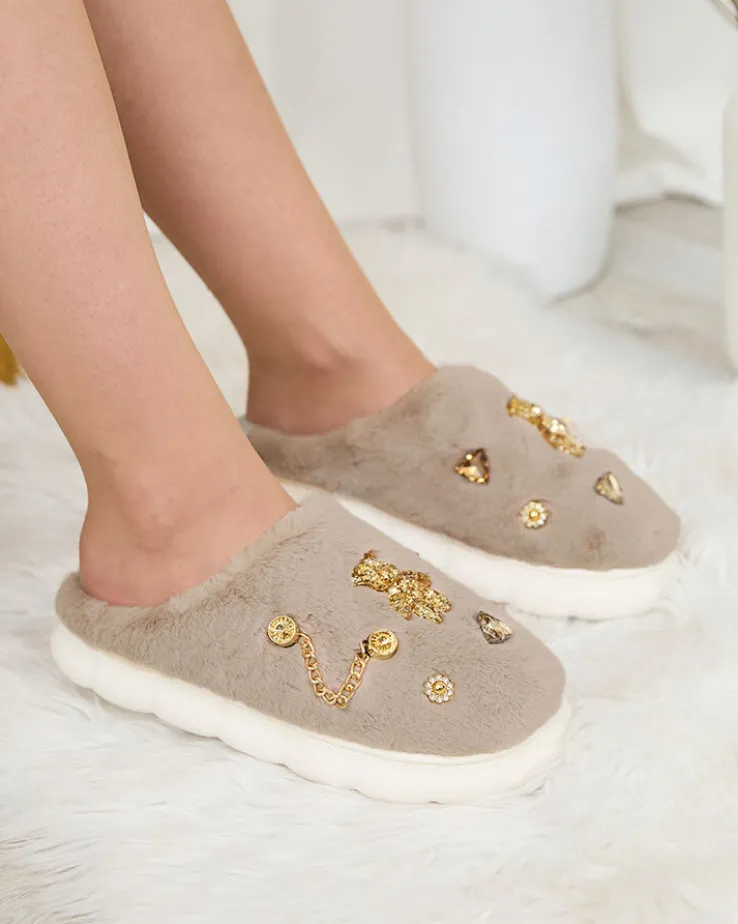 Royalfashion Szare damskie futrzane kapcie z ozdobami Erserra