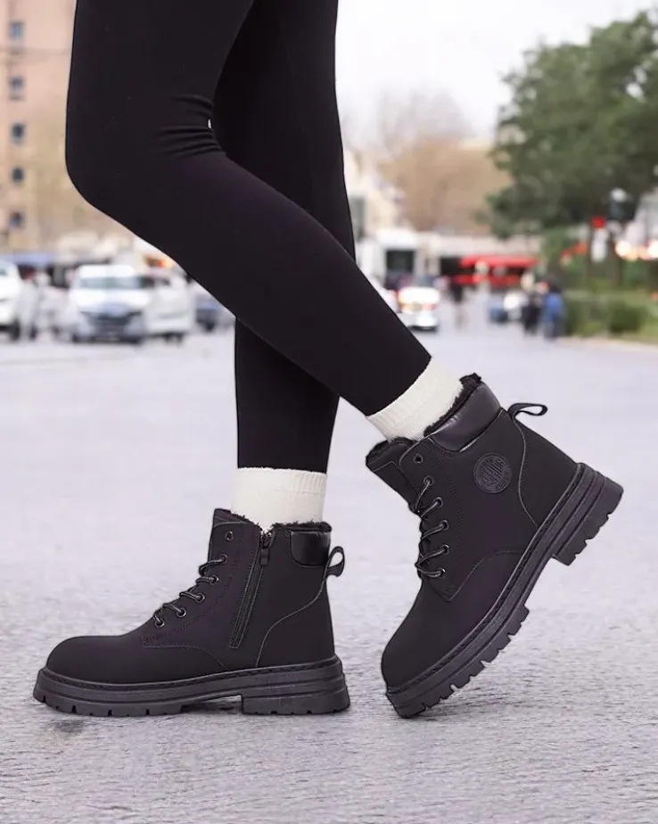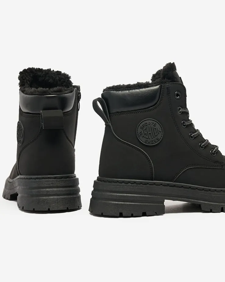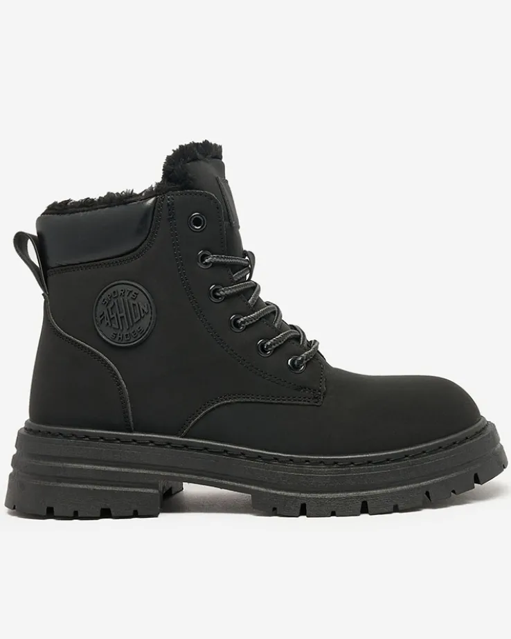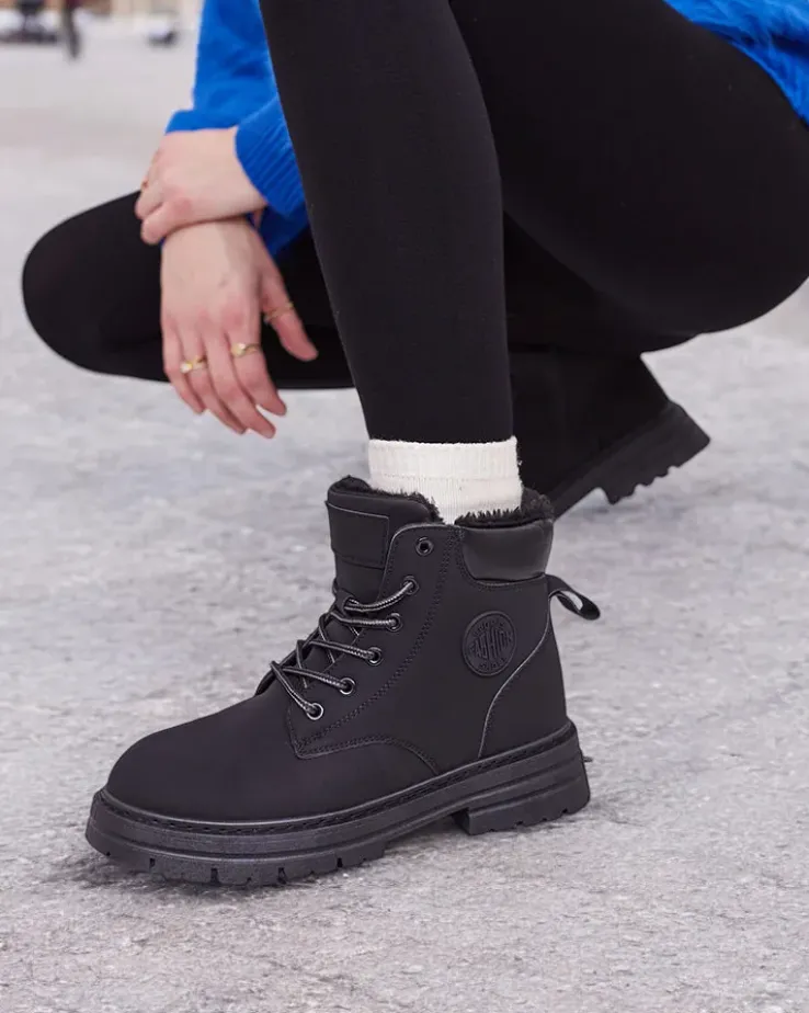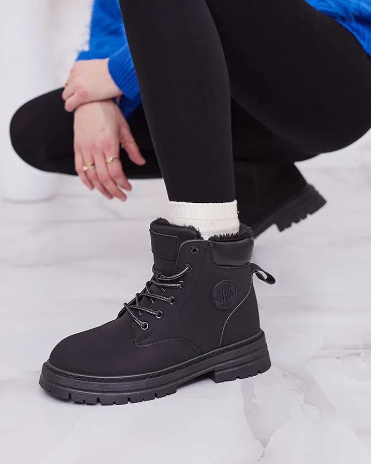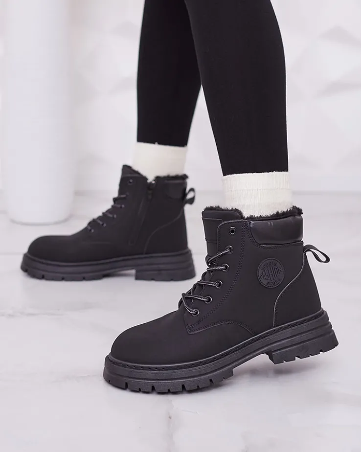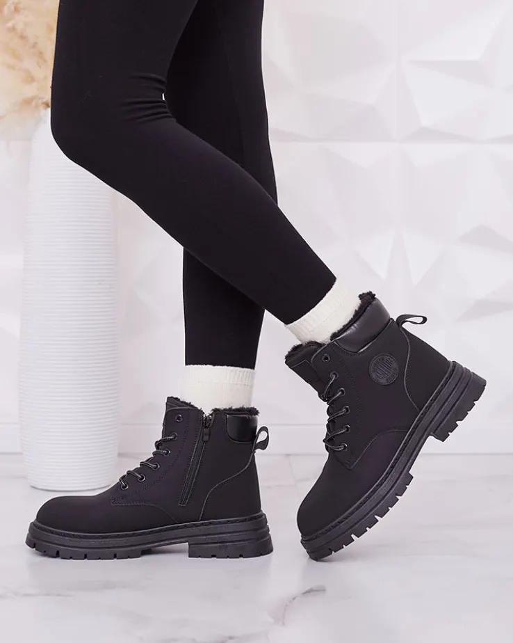 - Ocieplane trapery damskie, wykonane z eko nubuku. Cholewka wiązana, w środku ocieplenie w formie futerka. Konkretne buty na złą pogodę!
