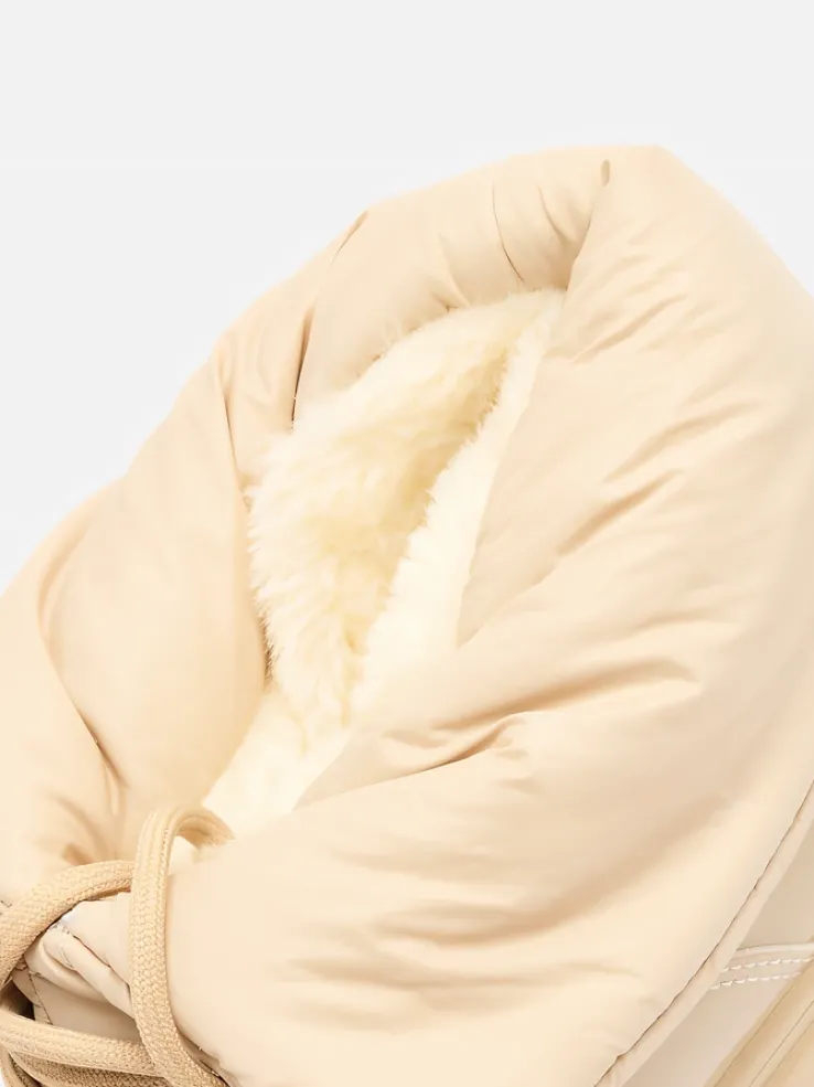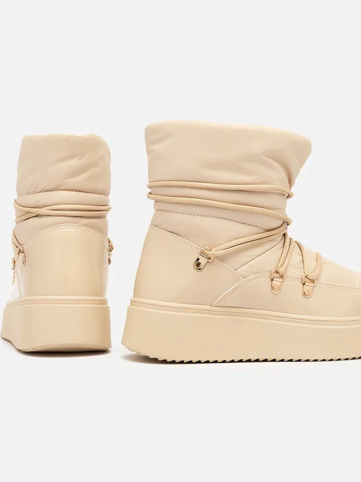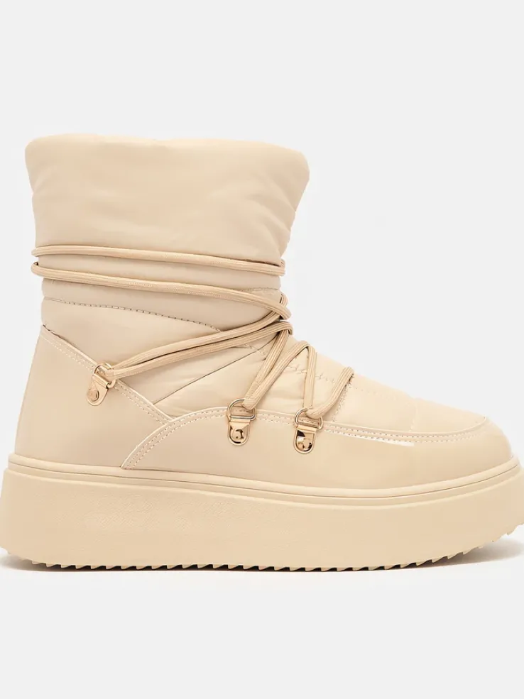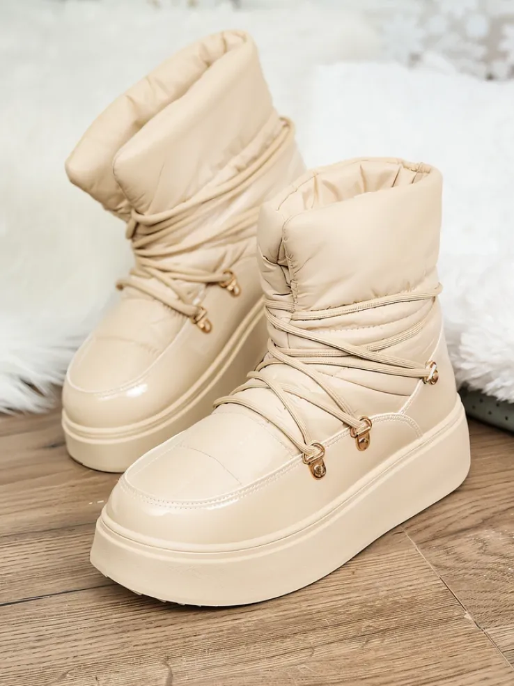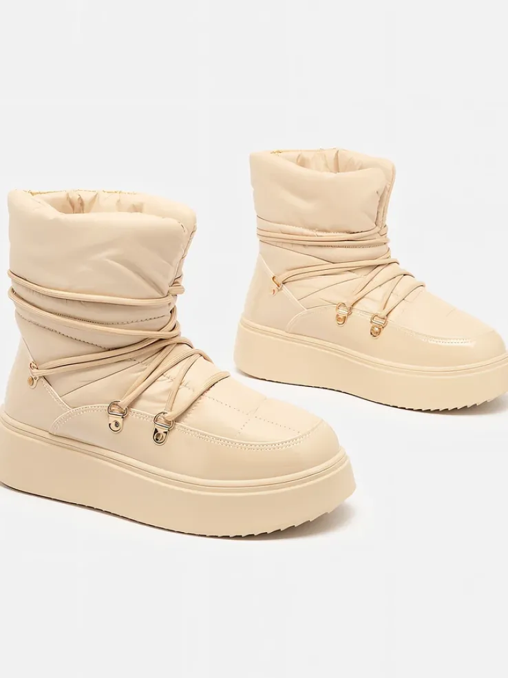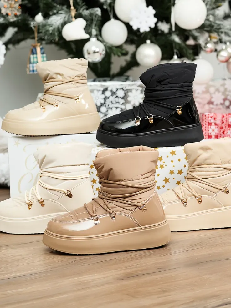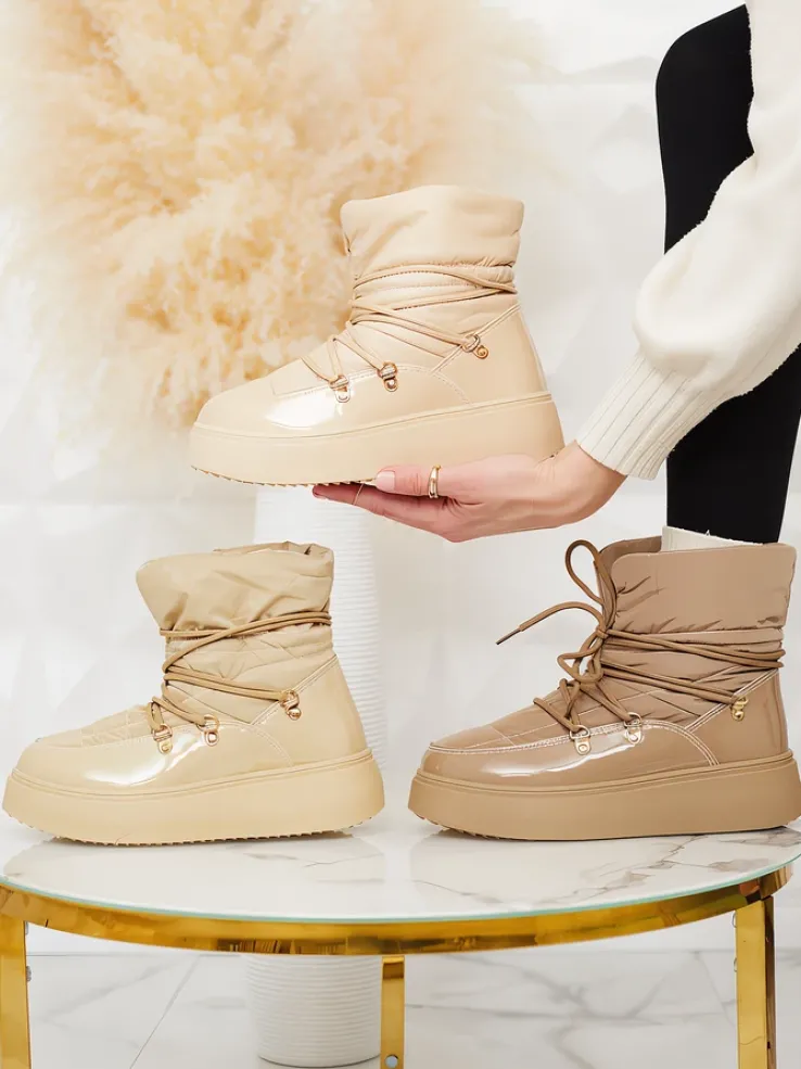 - Ponadczasowe damskie obuwie typu śniegowce. Cholewką wykonaną z materiału a’la cerata i wstawkami z lakierowanej skóry ekologicznej. W środku ocieplenie w formie futerka, obuwie sznurowane. Idealne na chłodniejszą porę roku!