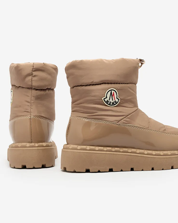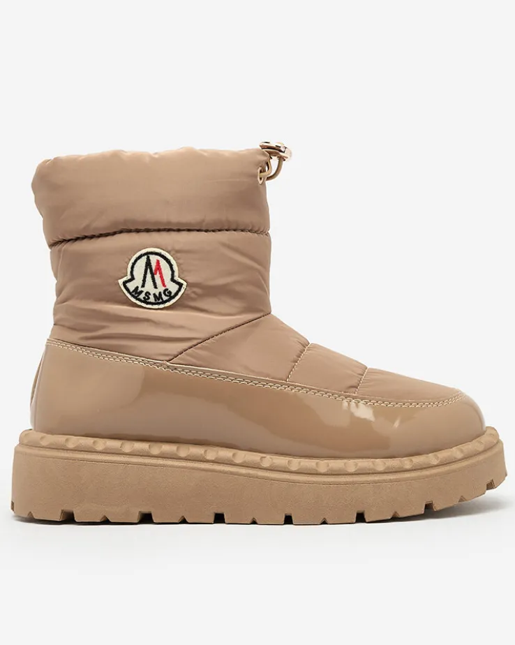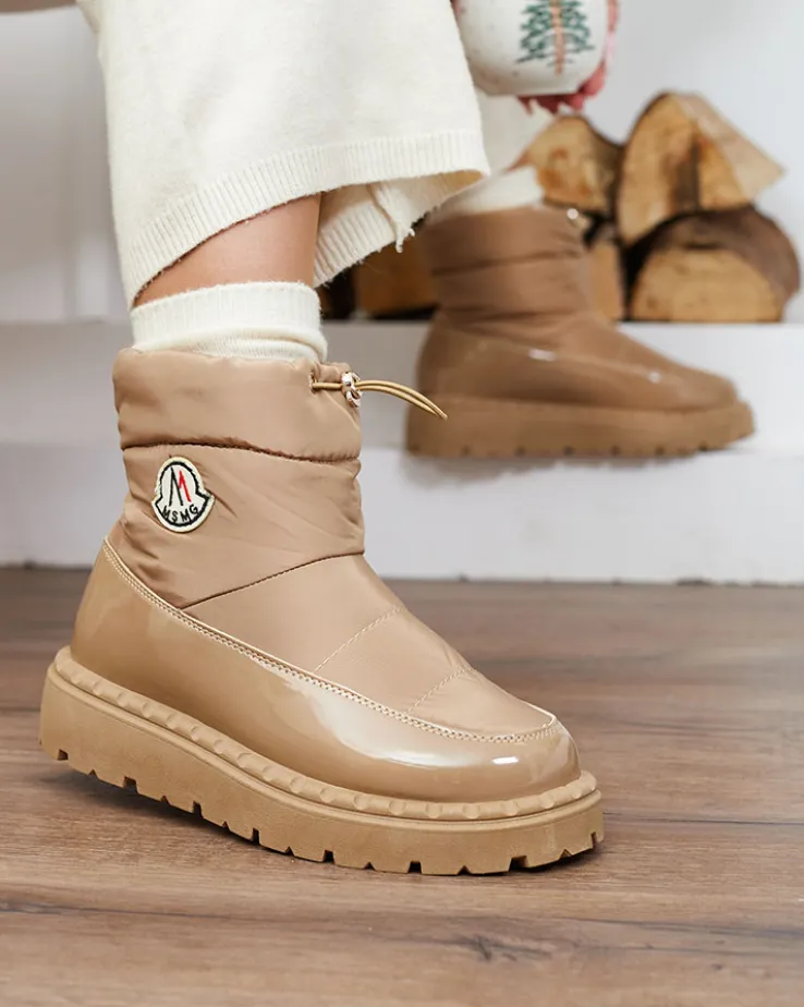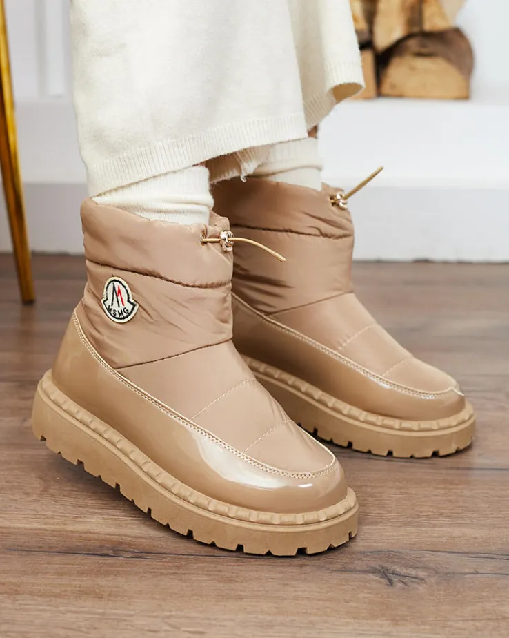 - Ponadczasowe damskie obuwie typu śniegowce z naszywką. Model cholewką wykonaną z materiału a’la cerata i wstawkami z lakierowanej eko-skóry. W środku ocieplenie w formie futerka, obuwie wsuwane i posiada ściągacz. Idealne na chłodniejszą porę roku!