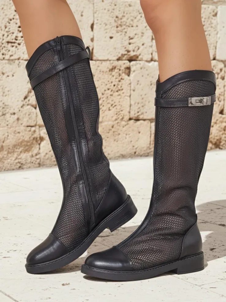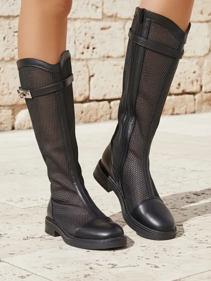 - Wyjątkowe botki damskie wykonane z tkaniny a’la siateczka i skóry ekologicznej z wykończeniem ażurowym oraz eko skórzanej wkładki. Model zapinany na zamek. Idealne do jesiennych stylizacji!.
