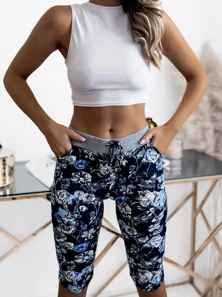 - Wygodne damskie spodenki z kieszeniami, wykonane z tkaniny bawełnianej w kwiaty. Model o długości 3/4, posiada gumę oraz wiązane toczki w pasie. UWAGA: Dokładność pomiaru (+/-) 1 cm.