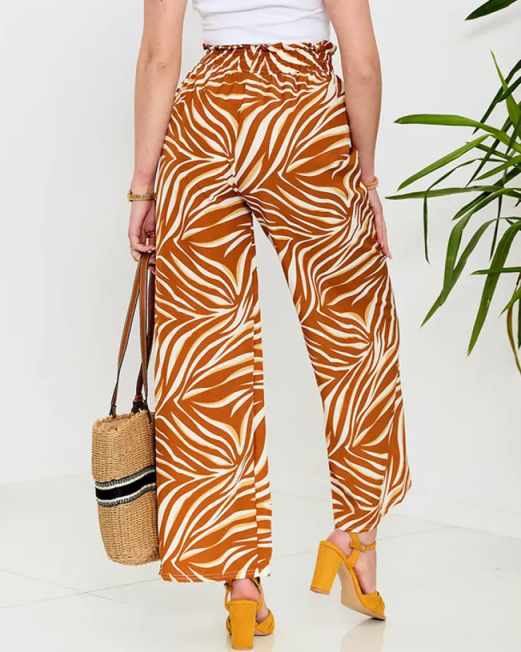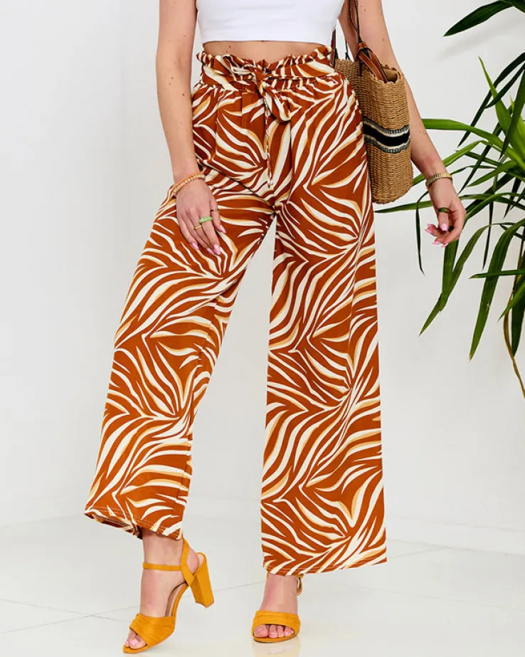 - Wzorzyste szerokie spodnie damskie. Model wykonany z lekkiej i zwiewnej tkaniny, posiada gumę oraz wiązanie podkreślające talię. Idealna baza do stylowych outfitów na wiosnę! UWAGA: Dokładność pomiaru (+/-) 1 cm.